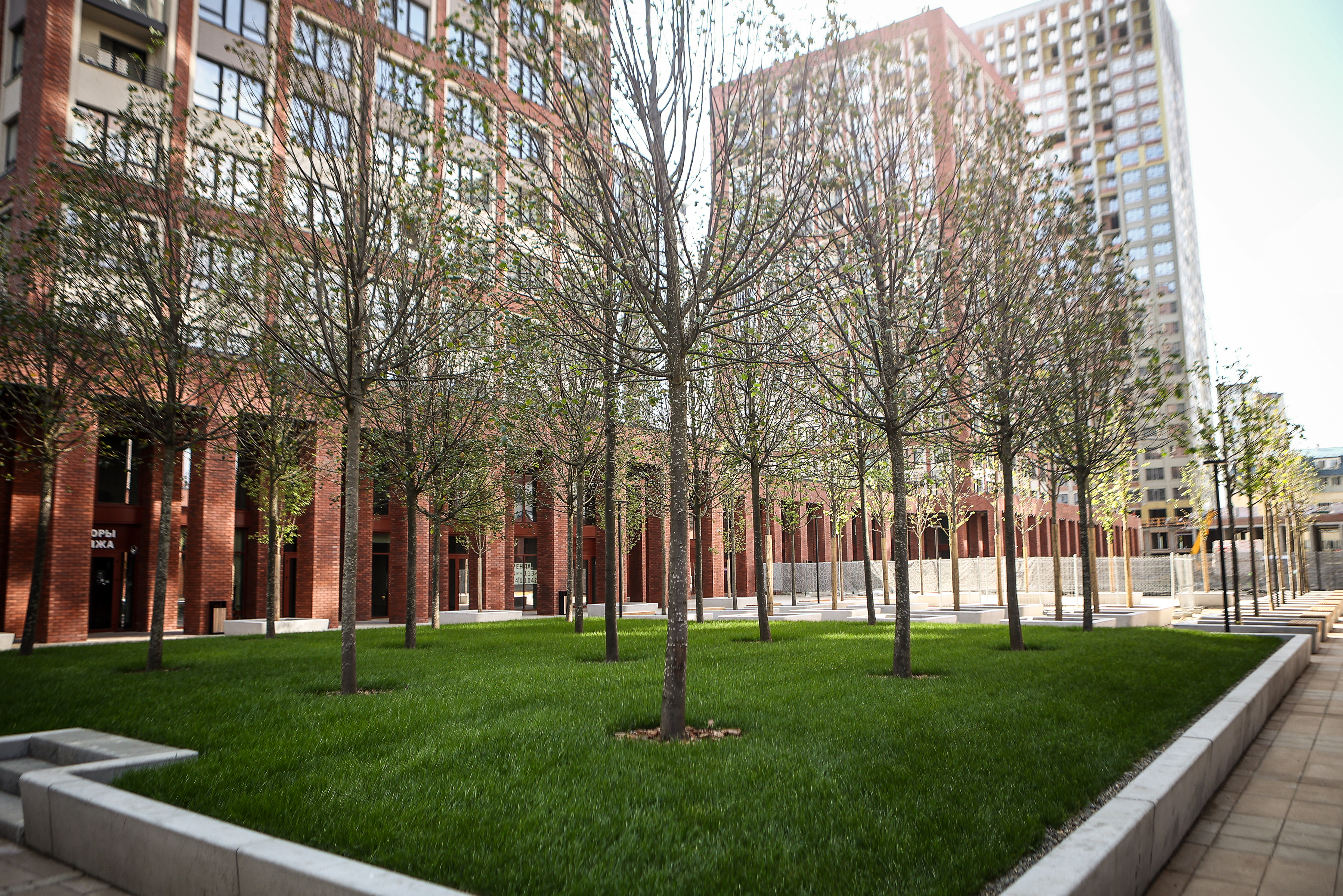 Дворы в «Мылзаводе» закрытые, расположены не внутри, а по периметру. Попасть туда можно, только если у вас есть ключ от входной двери в подъезд. Они оснащены миниатюрными игровыми площадками, скамейками и беседками. Снаружи и внутри квартала идут впечатляющие своими размерами галереи. На территории застройщик высадил крупномерные липы, берёзы, сосны и яблони, а также кусты сирени.