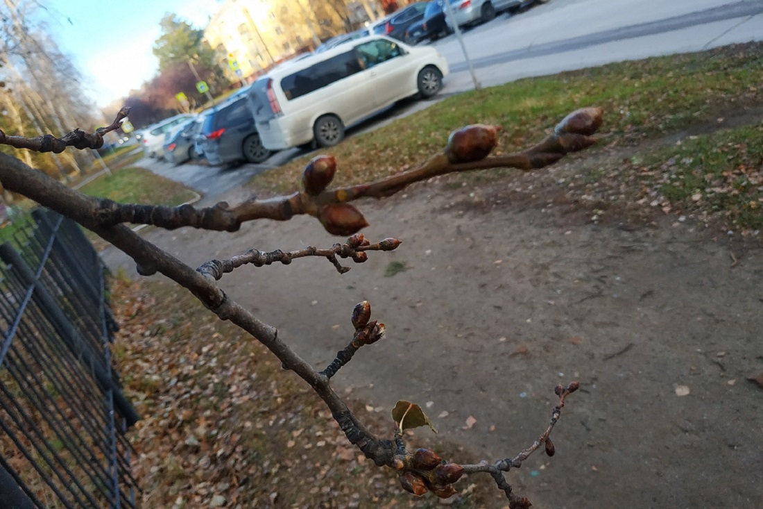 На дворе — почти ноябрь, а температура выше нормы. Земля не замерзает, а понемногу отдаёт тепло. При этом много дождей. Такая погода создала деревьям и кустарникам условия для «второй весны» — почки набухли и начали распускаться. В Новосибирске «проснулись» осина, сирень, черёмуха. Но осенняя зелень на ветках ─ лишь иллюзия скорого цветения.