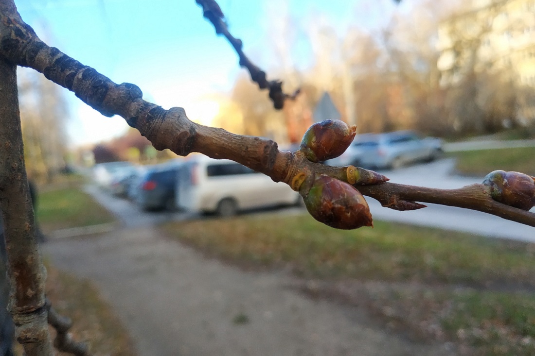 Аномально тёплая погода этой осенью обманывает природу. На ветках деревьев, которые недавно сбросили листья, распускаются набухшие почки.