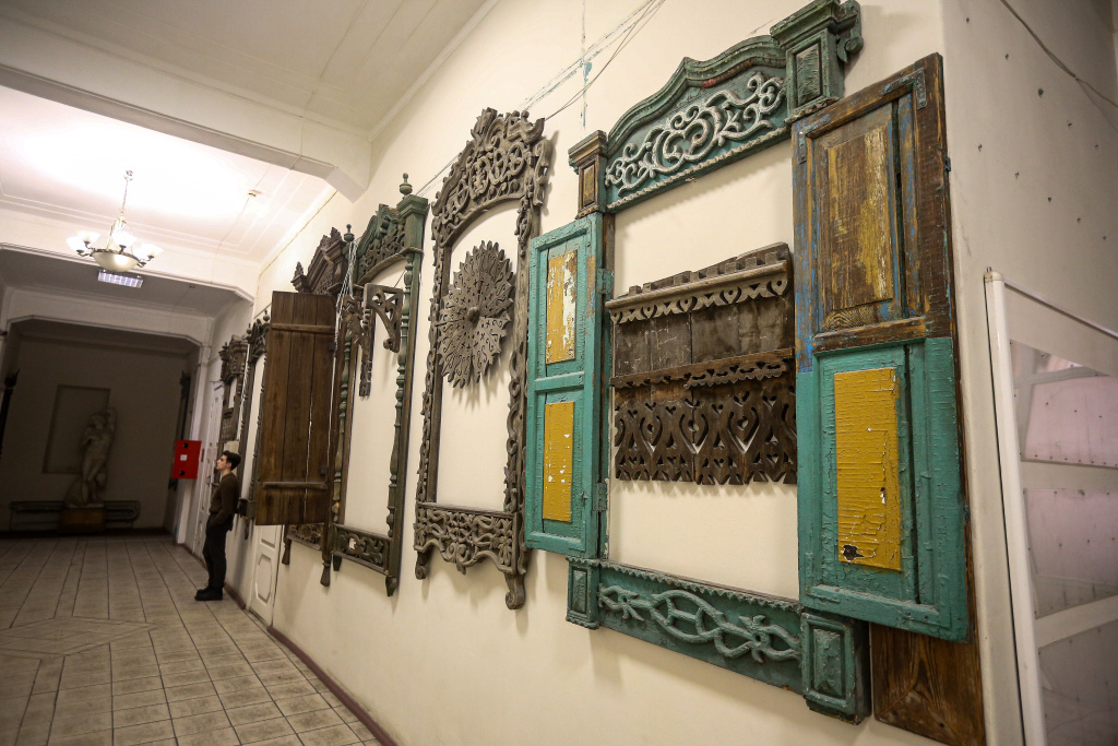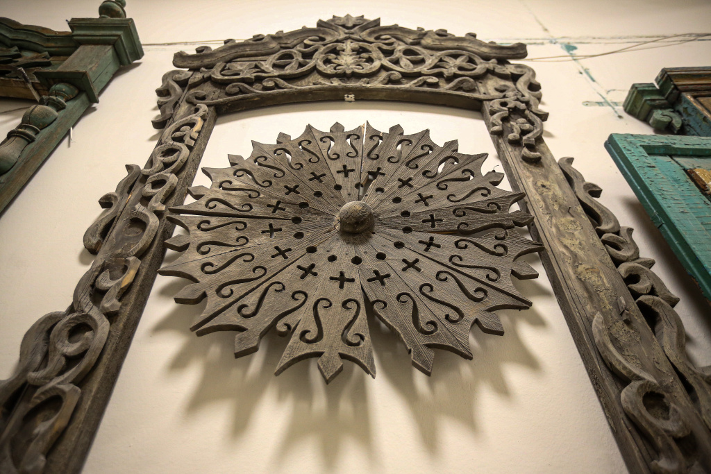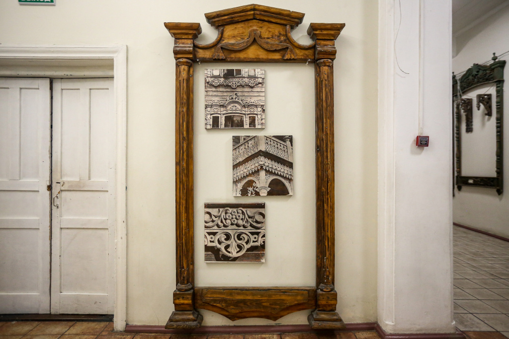 Это мощные наличники со сложными растительными орнаментами. Когда-то они украшали купеческие особняки в центре города. Дома те давно снесли, и только по размеру оконных окладов мы можем представить себе, насколько серьёзными были постройки начала XX века.