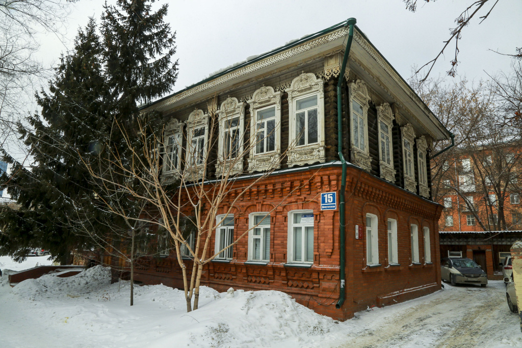 Деревянная двухэтажка, построенная на этом месте в 1905 году, сгорела в декабре 1999-го. В огне погибла вся бревенчатая часть с резным декором. Дом отстроили заново и полностью воспроизвели всё убранство. Теперь в самом центре Новосибирска — на углу Ленина и Урицкого — мы можем увидеть общественное здание начала XX века, сочетающее элементы барокко, классицизма и традиционной сибирской деревянной архитектуры.