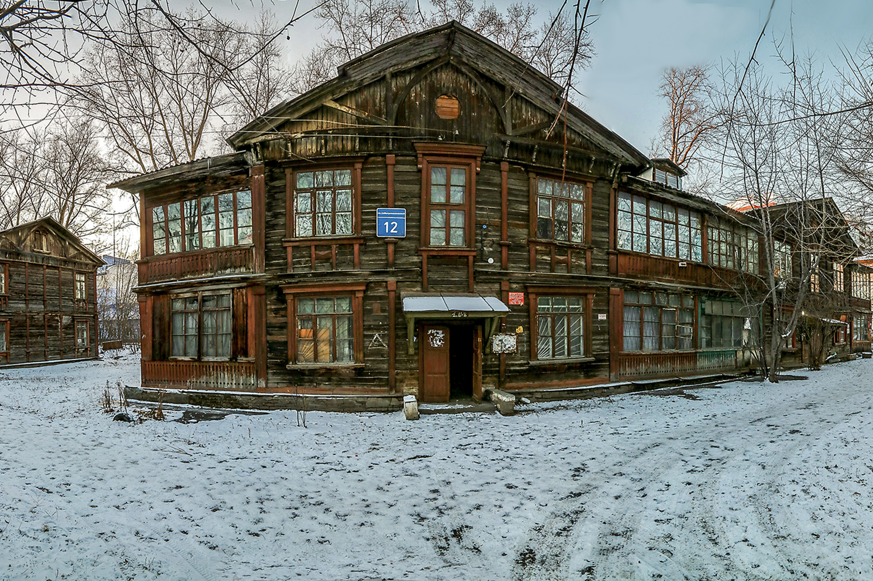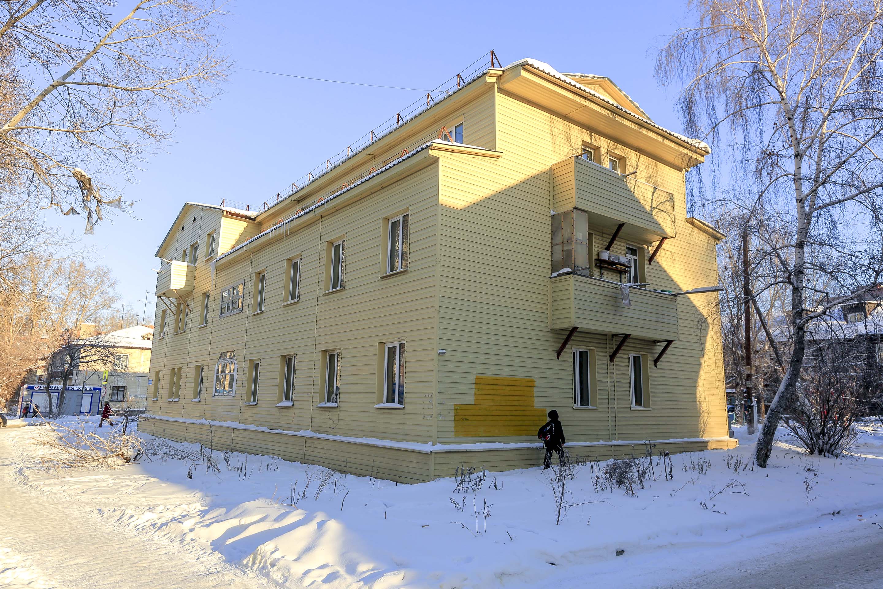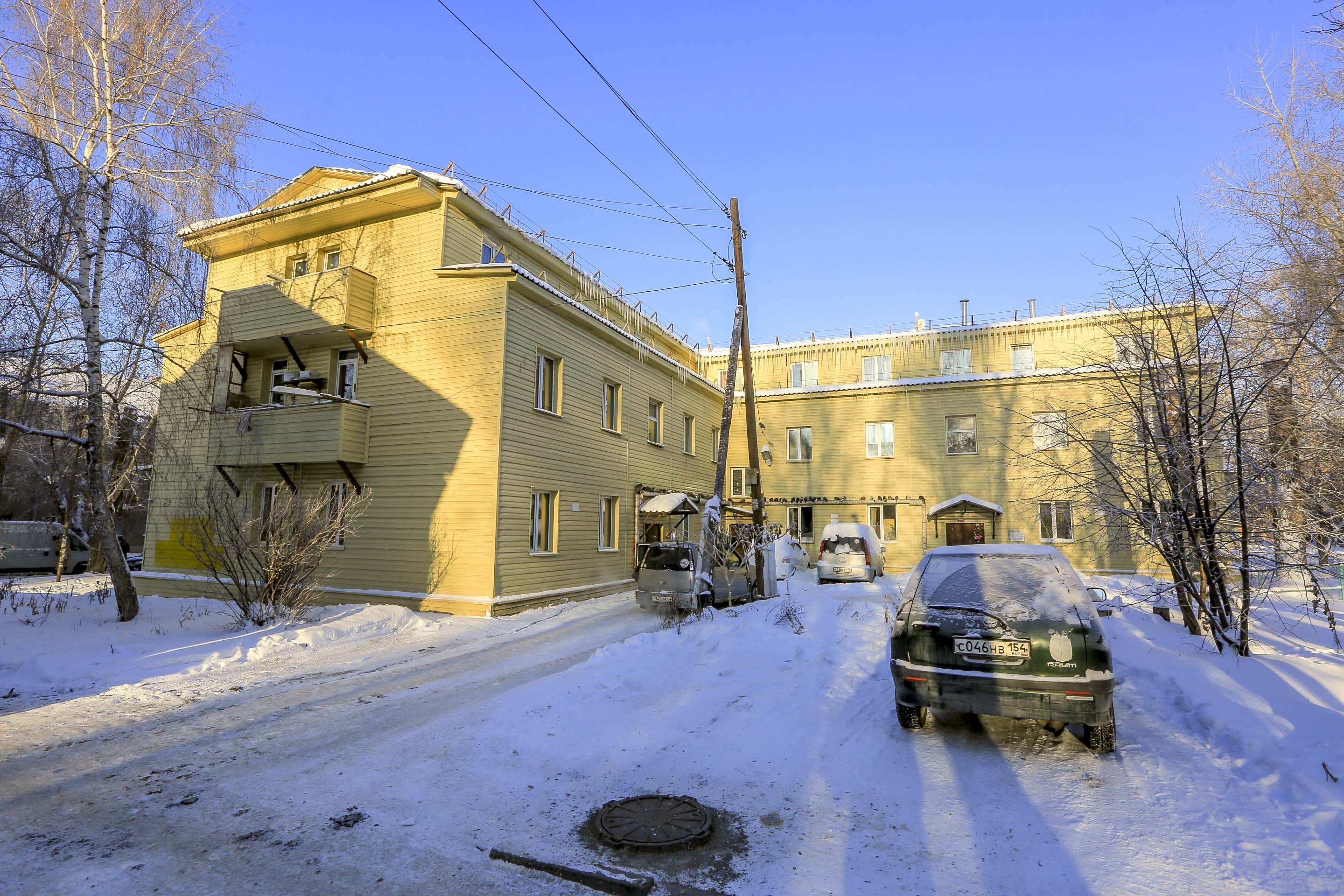 Комплекс из двух деревянных двухэтажек расположен в самом центре Новосибирска. В каждой из них — по два подъезда. Здания возвели в середине 1920-х годов. Это яркий пример малоэтажной жилой застройки довоенных лет. Видно, что дома недавно капитально отремонтировали, заменили окна и крышу.