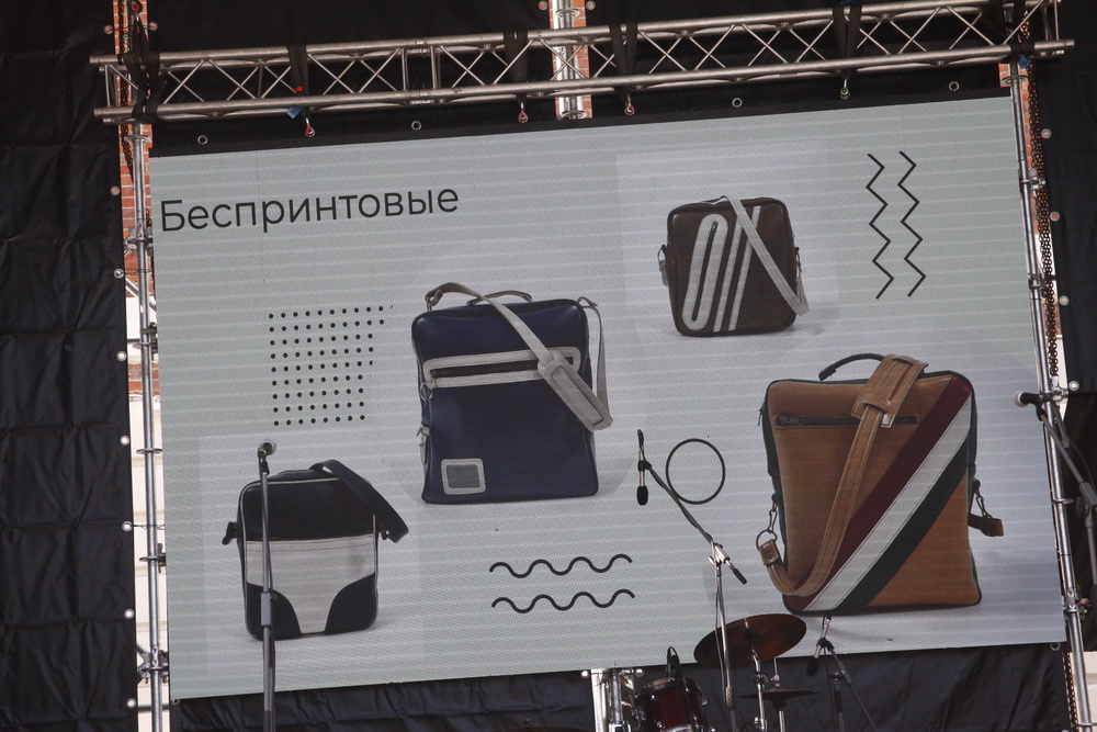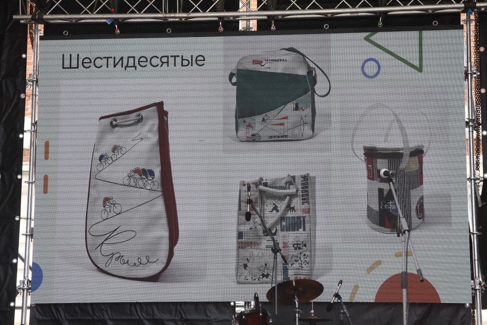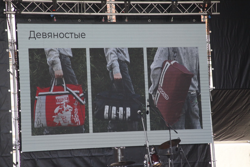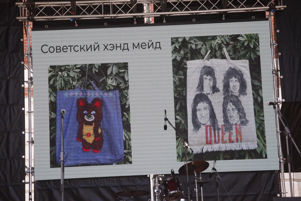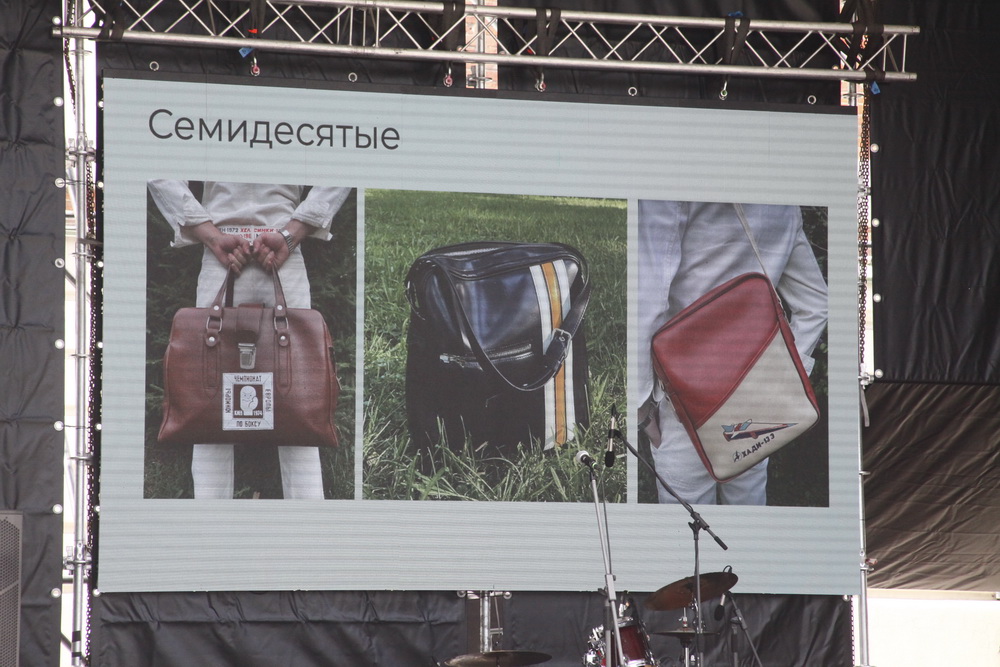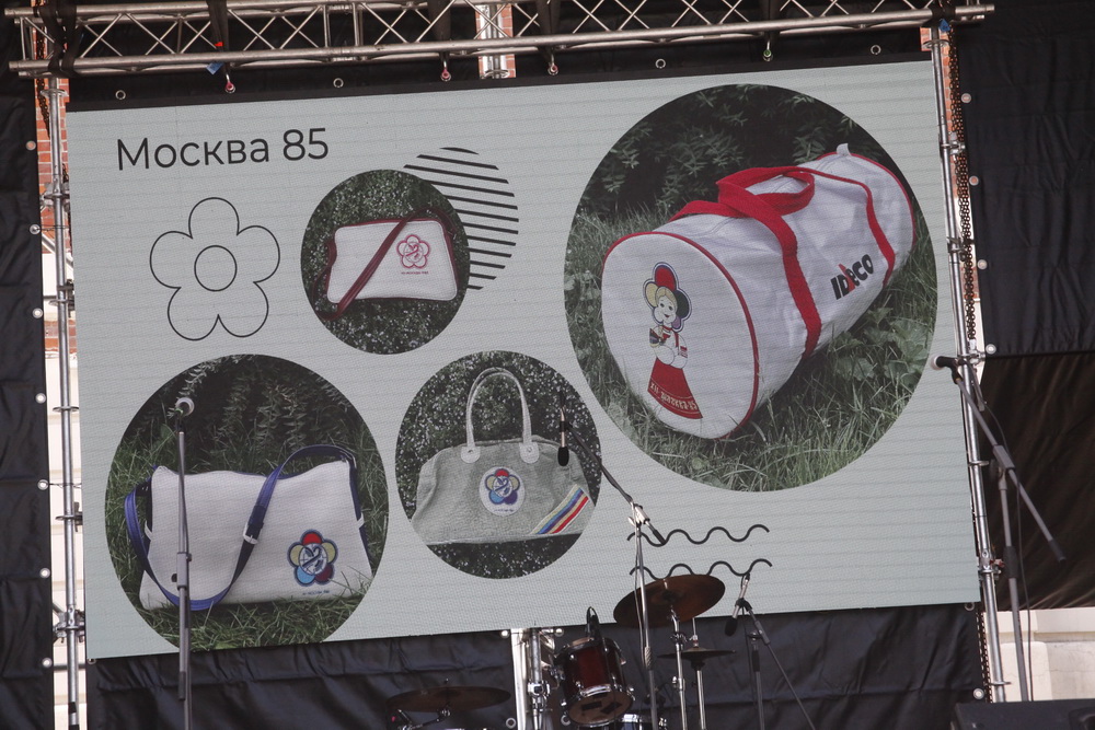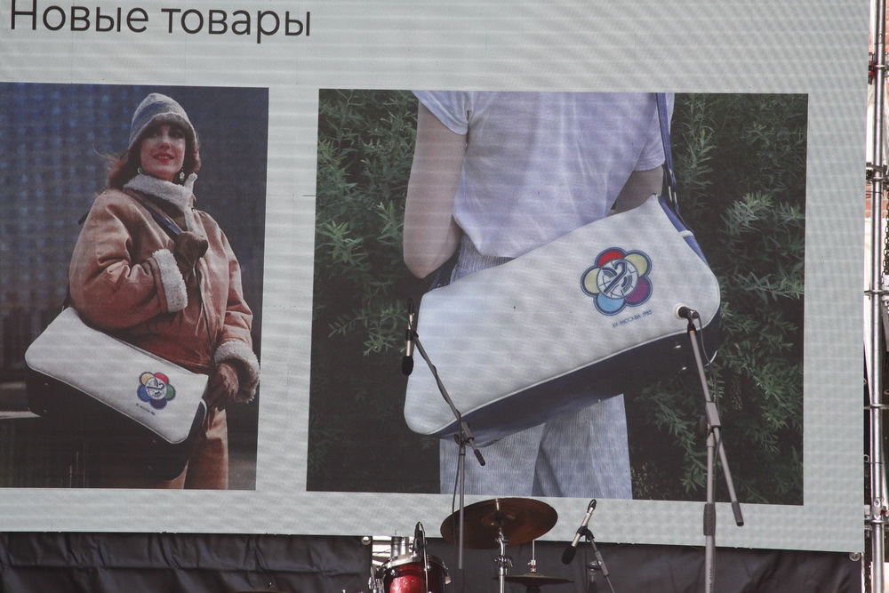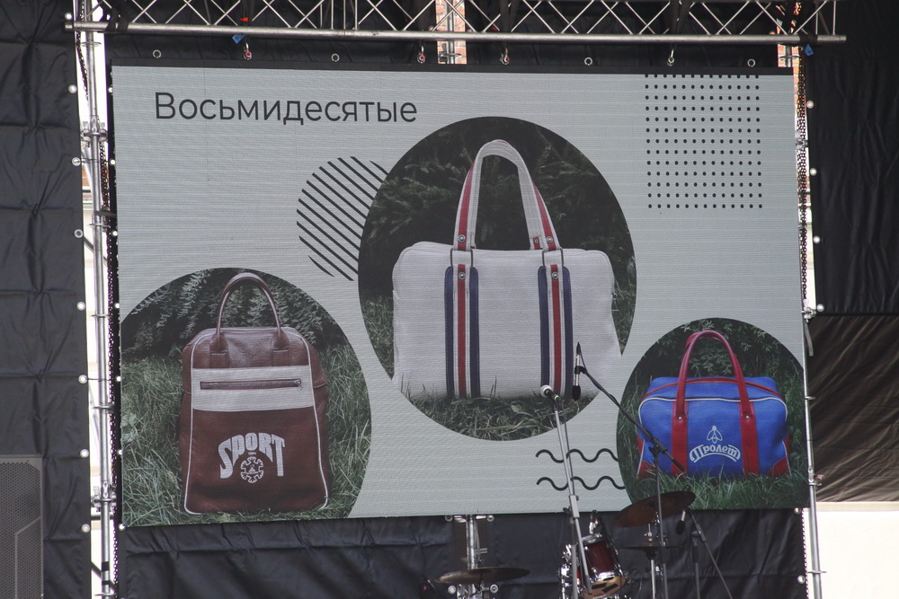 Ещё одна особенность того времени — сумки с принтами «хенд мейд», удивляющие красивым «идиотизмом» дизайна. Зрителям продемонстрировали, как выглядели советские шоперы с изображением Дина Рида, олимпийского медведя и группы Queen.