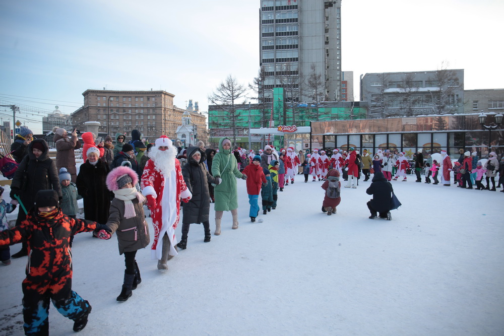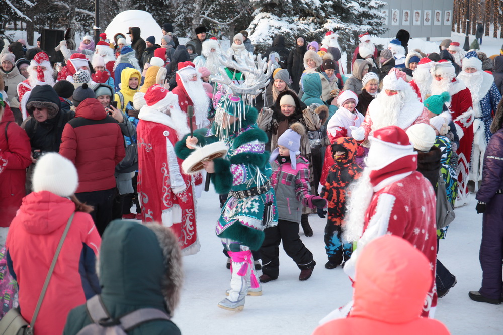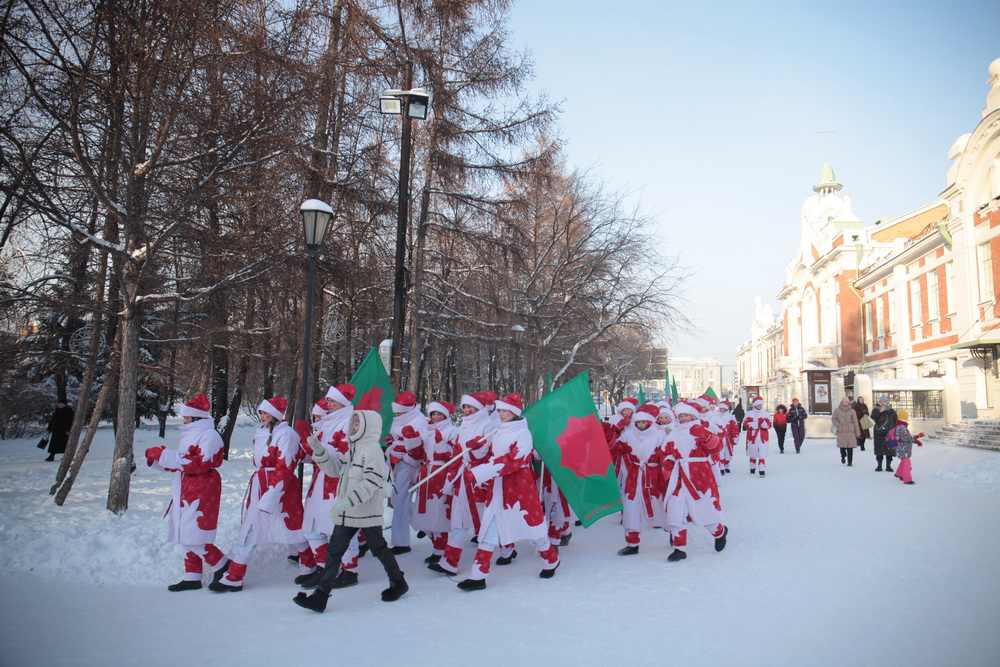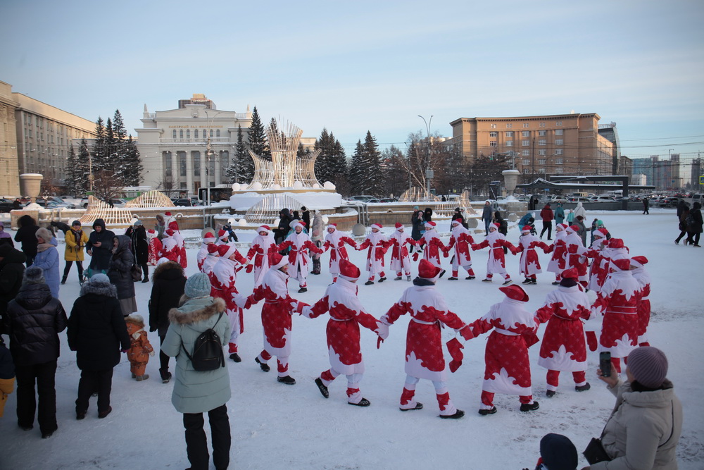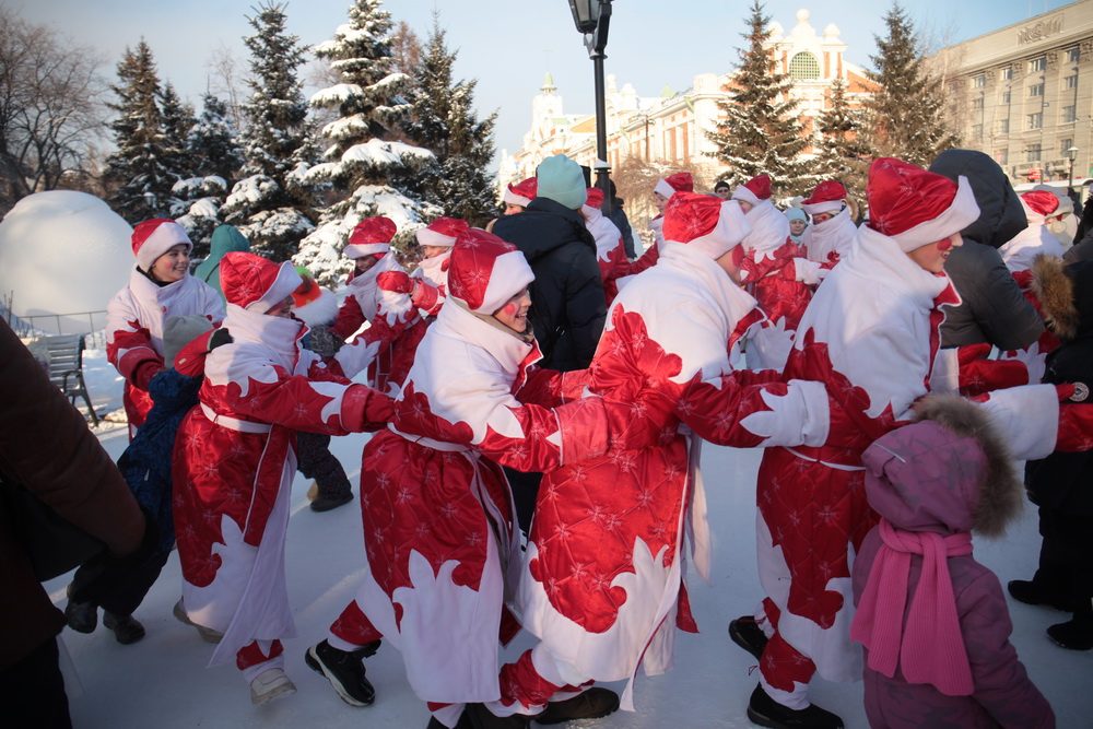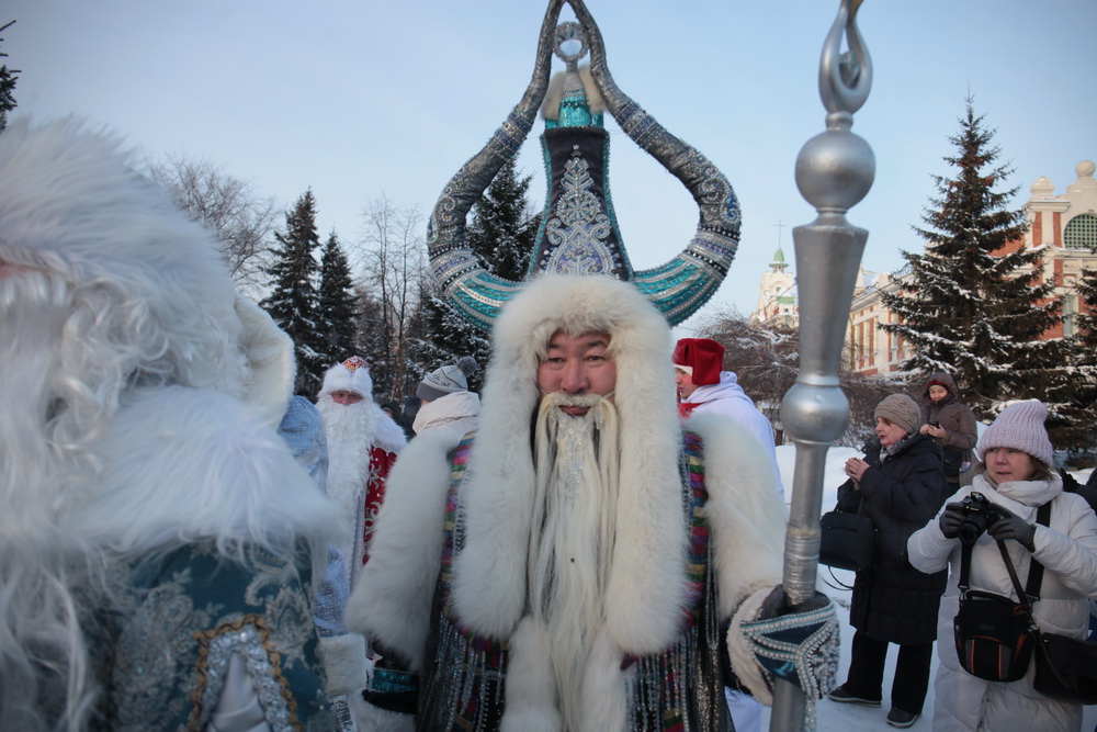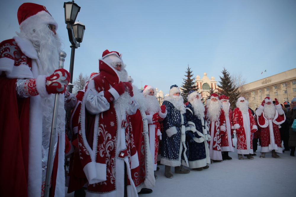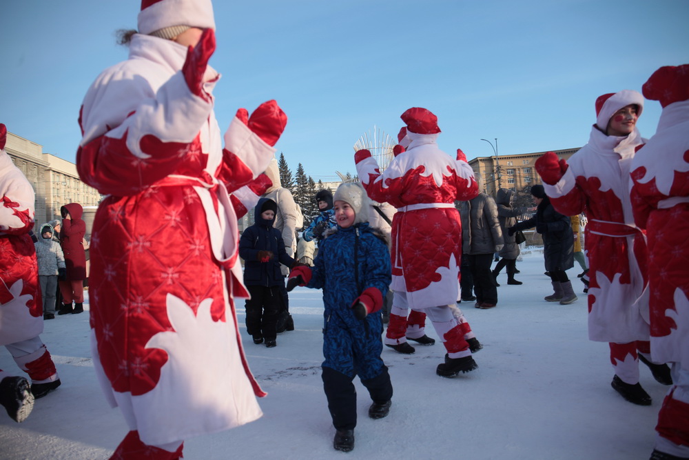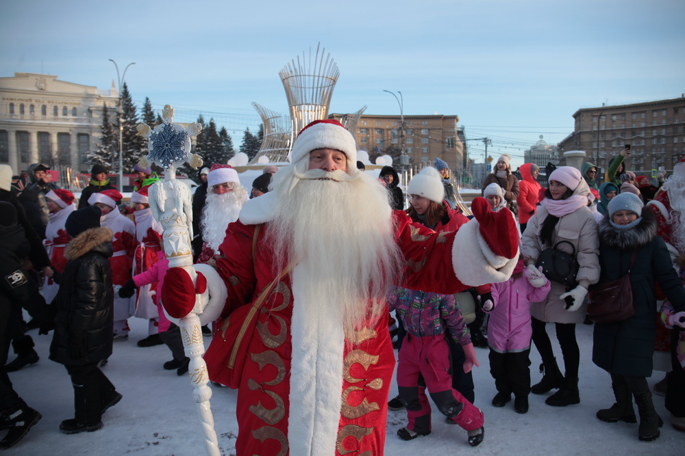 Чаем со льдом угостили в Новосибирске Дедов Морозов из разных российских регионов. Они прибыли в наш город накануне, а сегодня, 23 декабря, гуляли по улице Ленина, наряжали ёлки у кинотеатра «Победа», сделали сотни селфи с прохожими, играли и танцевали с детьми.