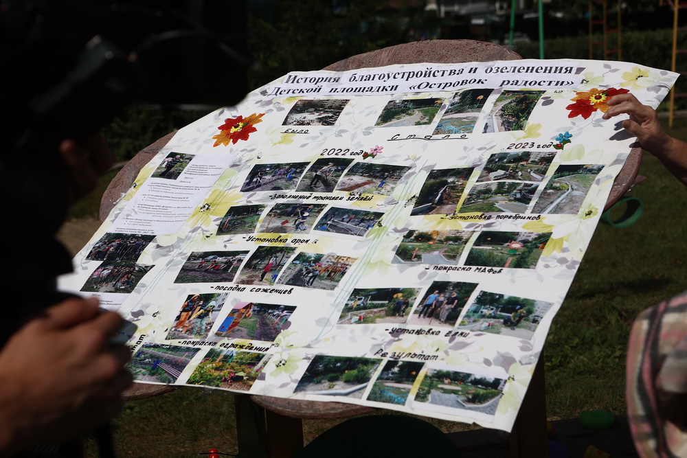 «Здесь была стоянка с одной и с другой стороны, хотелось обезопасить и создать какой-то уютный уголок для детей. Я даже название ему придумала — „Детский островок радости“, чтобы дети как в домике играли. Цветы посажены и арки сделаны за собственный счёт родителей. Нам большую помощь оказал питомник „Флоренс“. Он 100 ростков вяза дал! Видите, какая живая изгородь», — рассказывает о своём детище активистка ТОС «Берёзовая роща» Екатерина Никифорова.