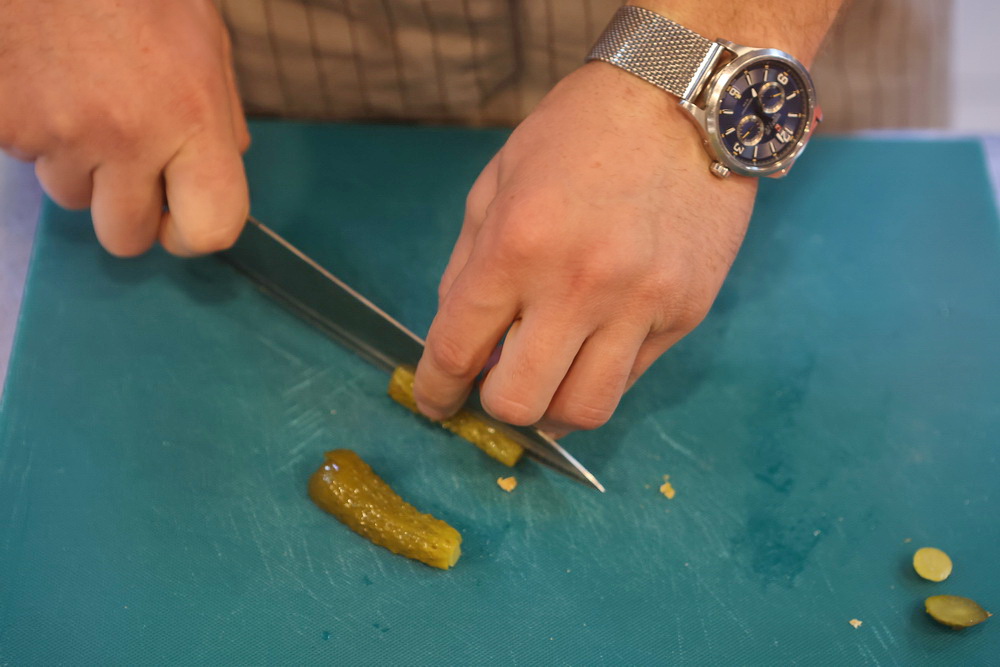 Cоус на основе греческого с добавлением горчицы и яблочного уксуса, перцев и соли.