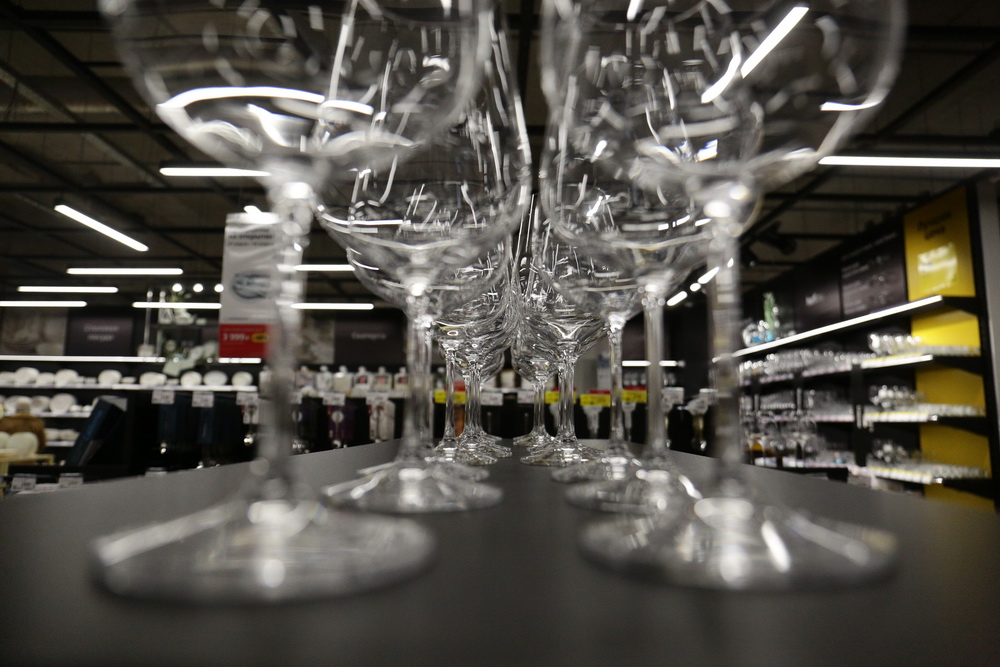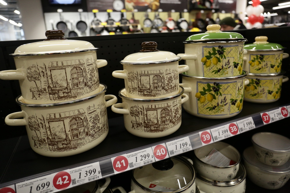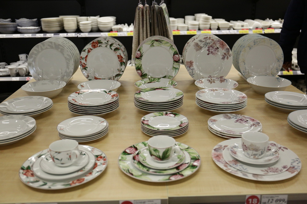 «Мама, это точно такой же магазин, как IKEA, только без фрикаделек», — на входе объясняет мужчина пожилой даме. «Ну ладно», — соглашается покупательница и бодрым шагом идёт к витринам с тарелками. Посуды в Hoff много, она весьма разнообразна — это все виды тарелок, салатников и креманок, сковороды и кастрюли, стаканы, фужеры и кружки, ложки всех размеров.