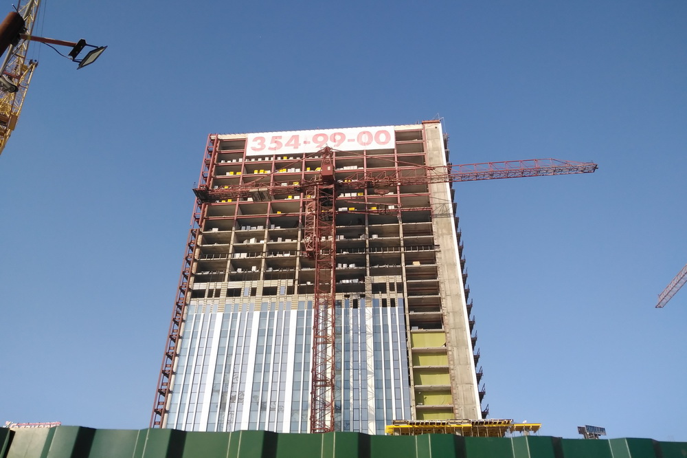 На самых верхних этажах гостиницы «Турист», которую достраивают на площади Маркса, появился огромный баннер с номером телефона. Застройщик начал искать арендаторов и покупателей для площадей будущего многофункционального комплекса.