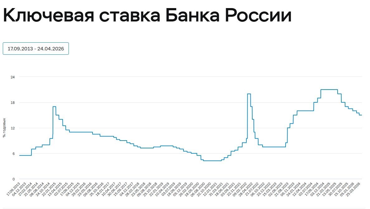 Постепенное снижение ключевой ставки происходит с июня 2025 года. До этого в течение полугода показатель держался на пике — 21%.
