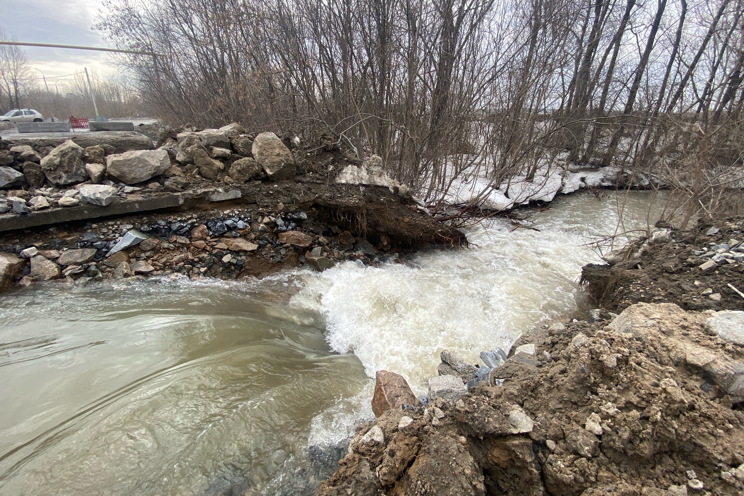 Департамент дорожно-благоустроительного комплекса принял решение об экстренных мерах: на участке проезжей части, ведущей к микрорайону «Европейский берег», выкопали глубокую траншею, которая обеспечит отвод воды в речку Плющиху.