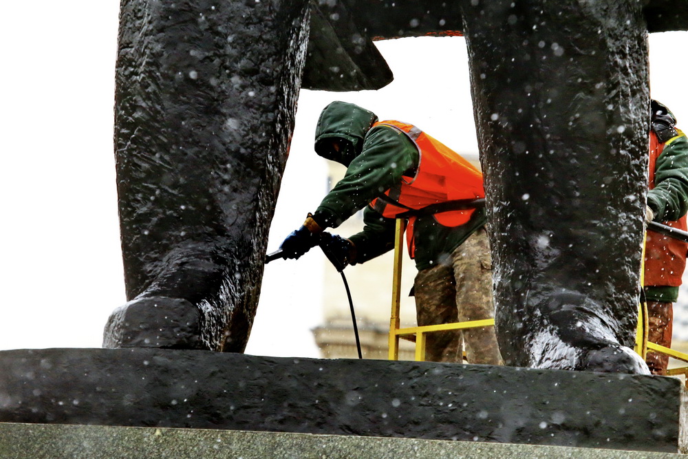 На гигиенические процедуры потратили больше 3000 литров воды с шампунем, мыли почти четыре часа. Скульптуры и памятники сейчас готовят к весне по всему Новосибирску.
