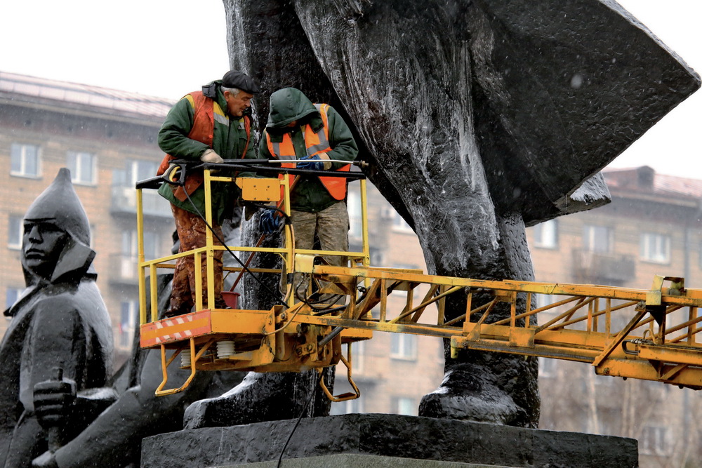 Высота памятника — 6,5 метра. Это одна из самых высоких статуй в Новосибирске. И чтобы привести её в порядок, подгоняют специальную технику — 10-метровую вышку. Рабочие чистят монумент щётками, а также используют мойки высокого давления.