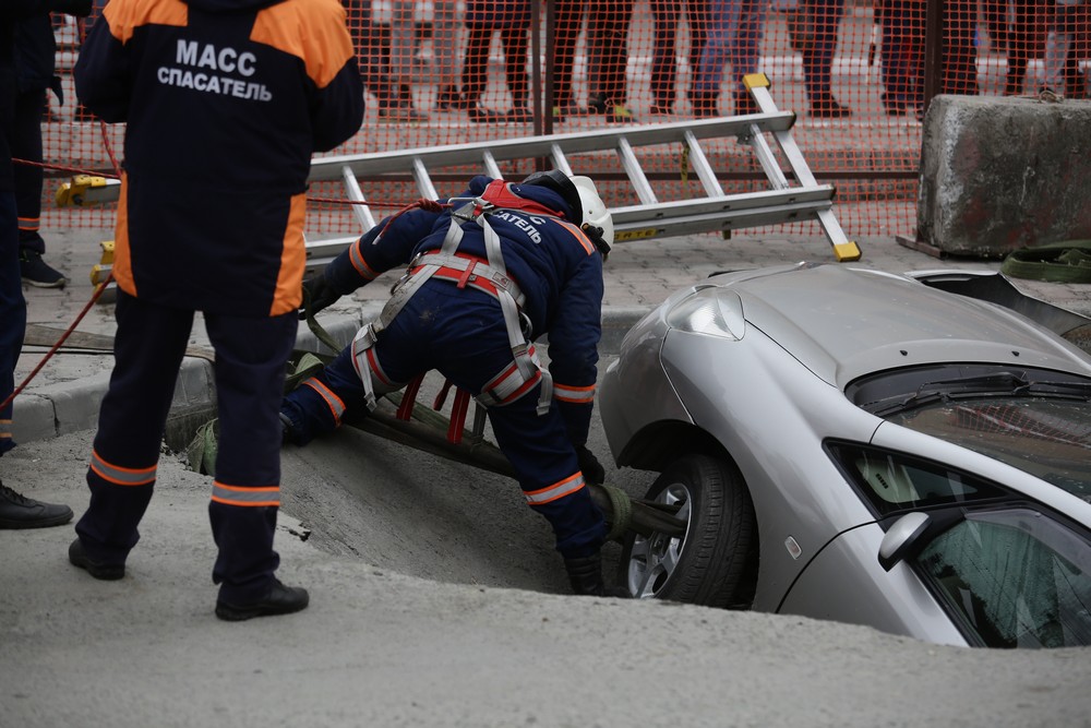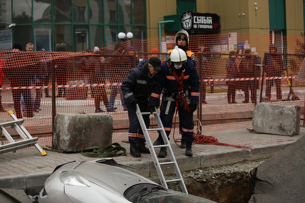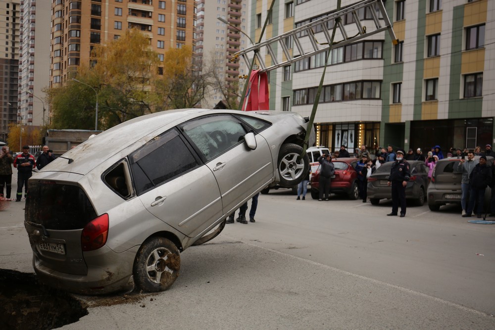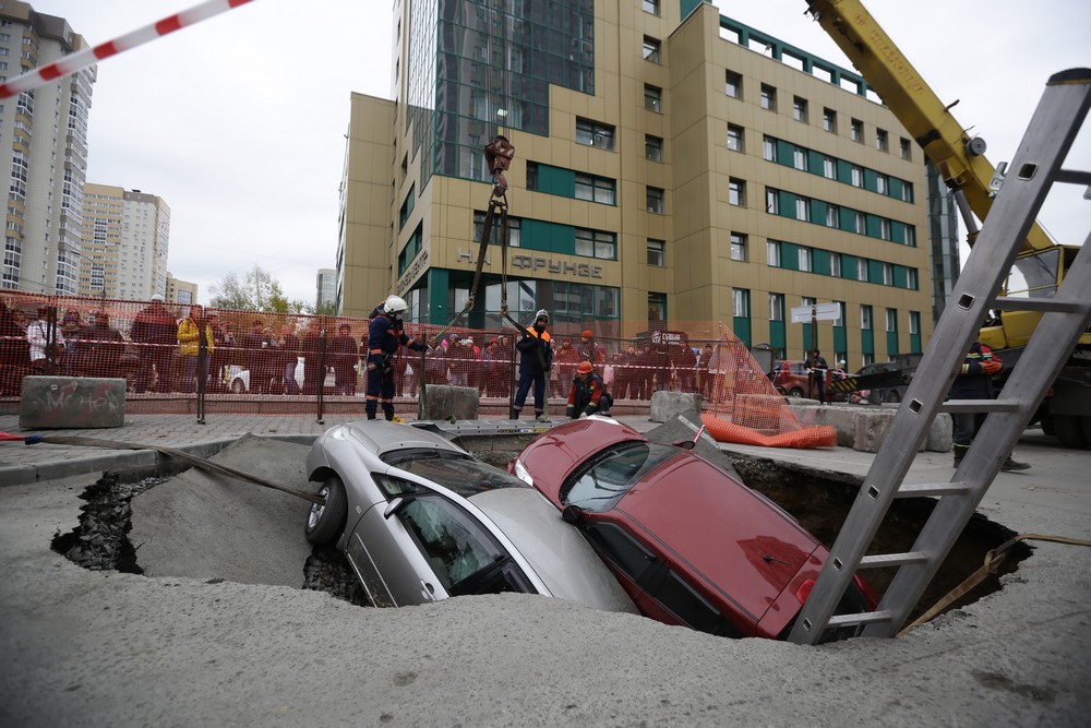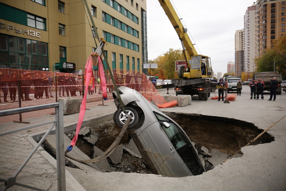Асфальт под парковочным карманом провалился на пересечении улиц Фрунзе и Семьи Шамшиных в Новосибирске. Разлом оказался огромным: под землю ушли две машины, а третья повисла на краю провала — её успели выдернуть на тросе. Случившееся уже прокомментировали теплоэнергетики.