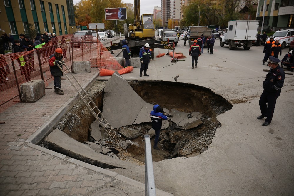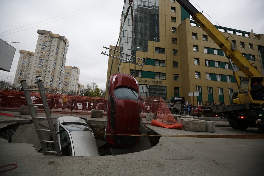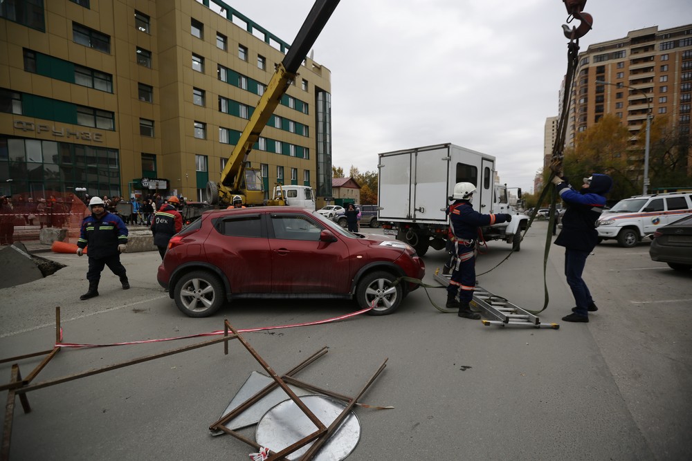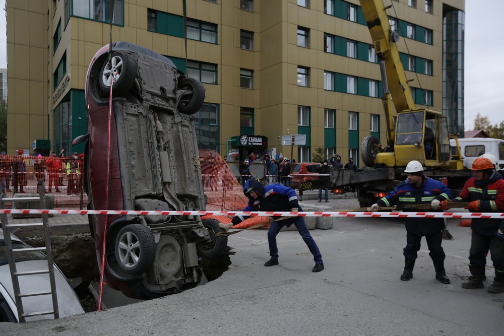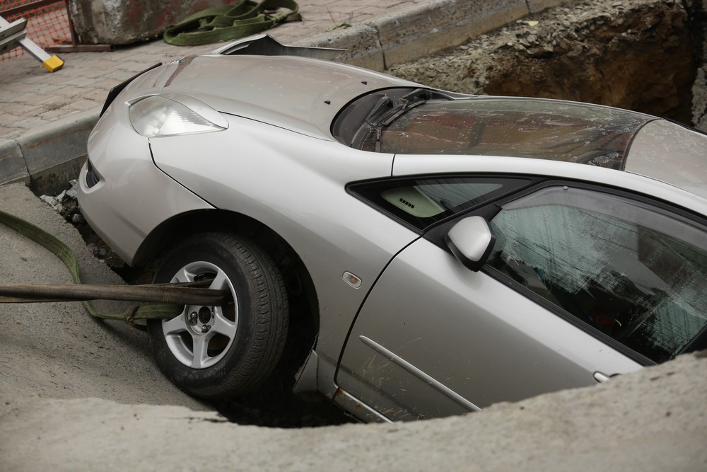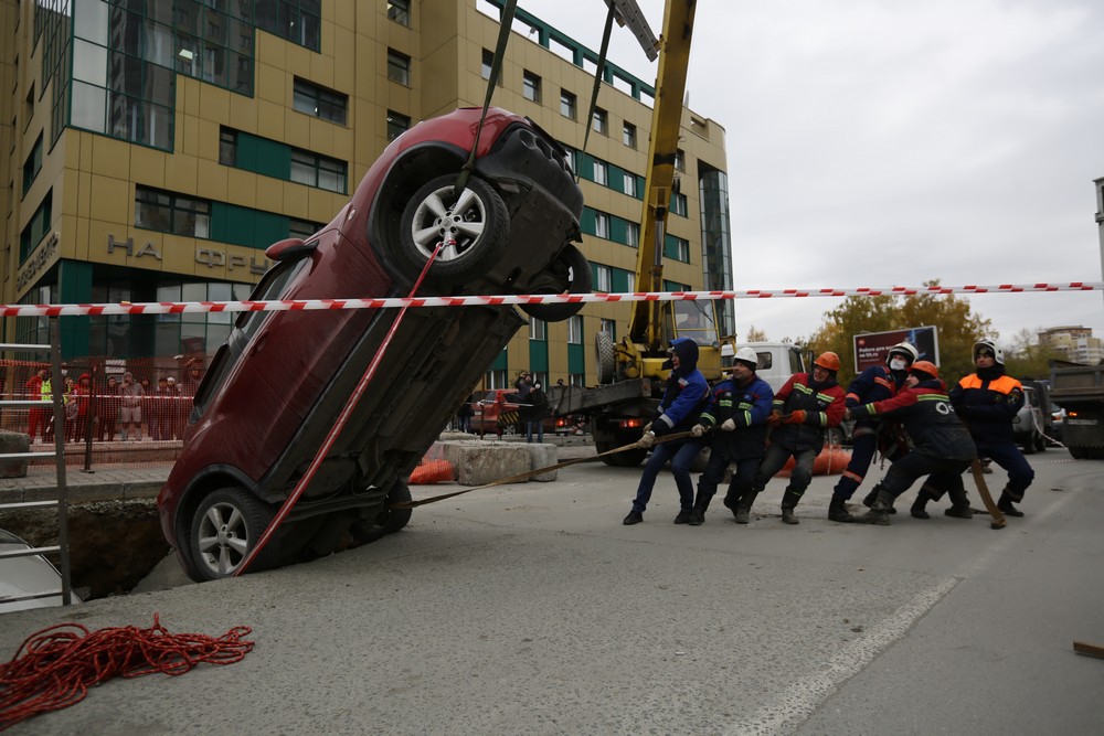 Асфальт под парковочным карманом провалился на пересечении улиц Фрунзе и Семьи Шамшиных в Новосибирске. Разлом оказался огромным: под землю ушли две машины, а третья повисла на краю провала — её успели выдернуть на тросе. Случившееся уже прокомментировали теплоэнергетики.