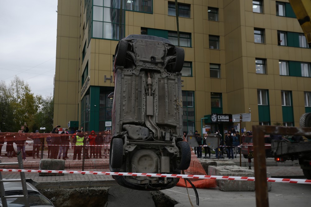 Ещё один кроссовер, Lexus, повис на краю ямы — машину вовремя успели вытащить и отбуксировать на безопасное расстояние с помощью УАЗика. Случившееся напоминает настоящую автомобильную заваруху. Очевидцы сообщают, что из ямы идёт пар.