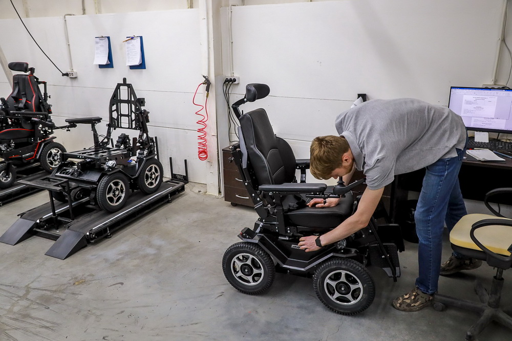 Эти и другие электроколяски испытывает пилот компании Caterwil Юрий Ларин. В инвалидном кресле мужчина находится более 20 лет, почти десять из них он занимается кибатлоном, кибатлетикой, четыре года назад освоил футбол и сразу показал хорошие результаты.