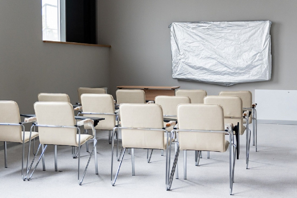 Сейчас всем необходимым оснащают пространство на первом этаже. Его можно будет использовать по-разному. Большой интерактивный экран, сцена и дополнительные стулья позволят проводить лекции, выступать с докладами, устраивать творческие мероприятия.