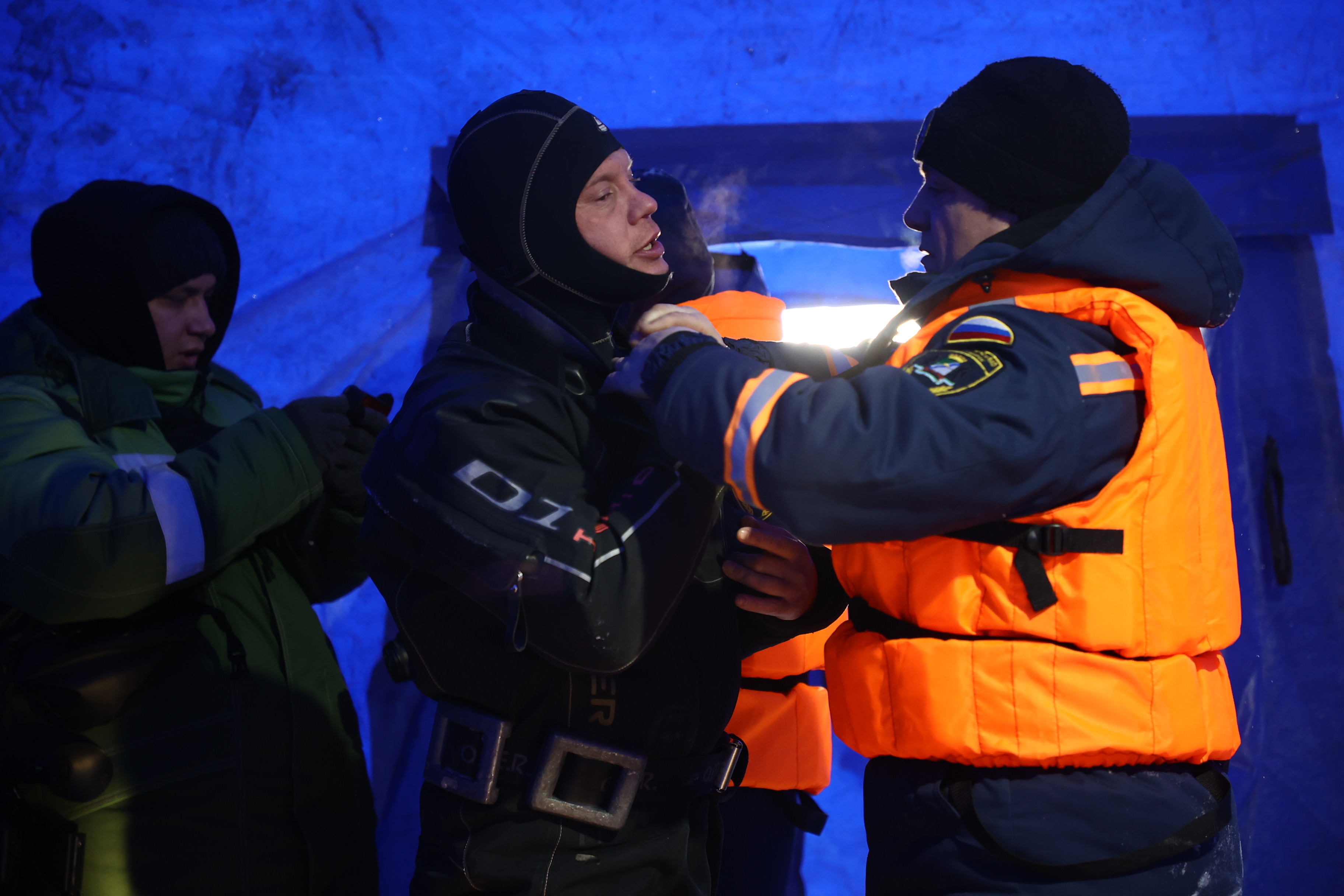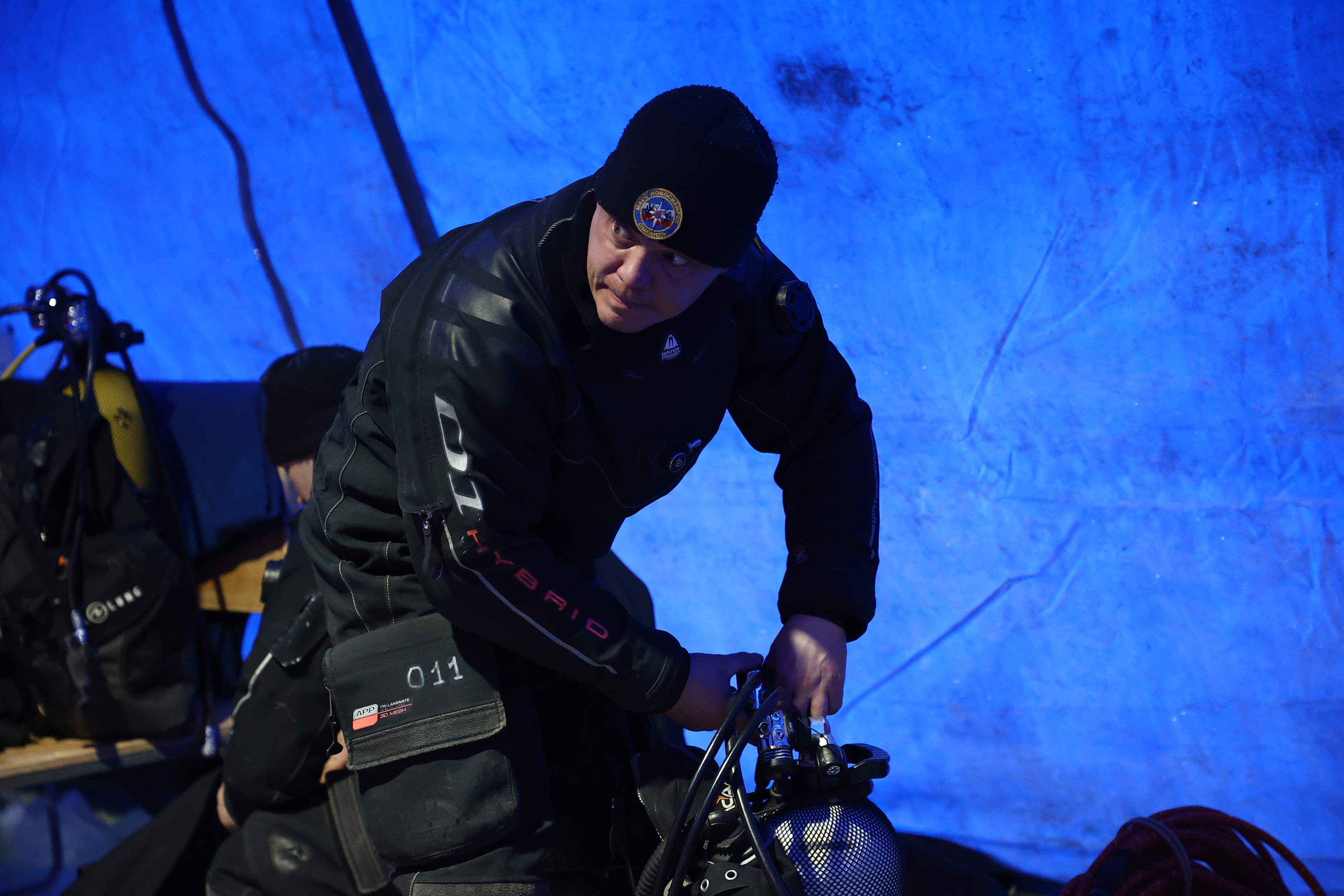 «Я выполняю обязанности страхующего водолаза. Если что-то случится, я сразу включусь и пойду. Всё равно волнение должно быть. Если начинаешь вести себя расслабленно, допускаешь банальные ошибки», — комментирует сотрудник муниципальной аварийно-спасательной службы Новосибирска Егор Попов.