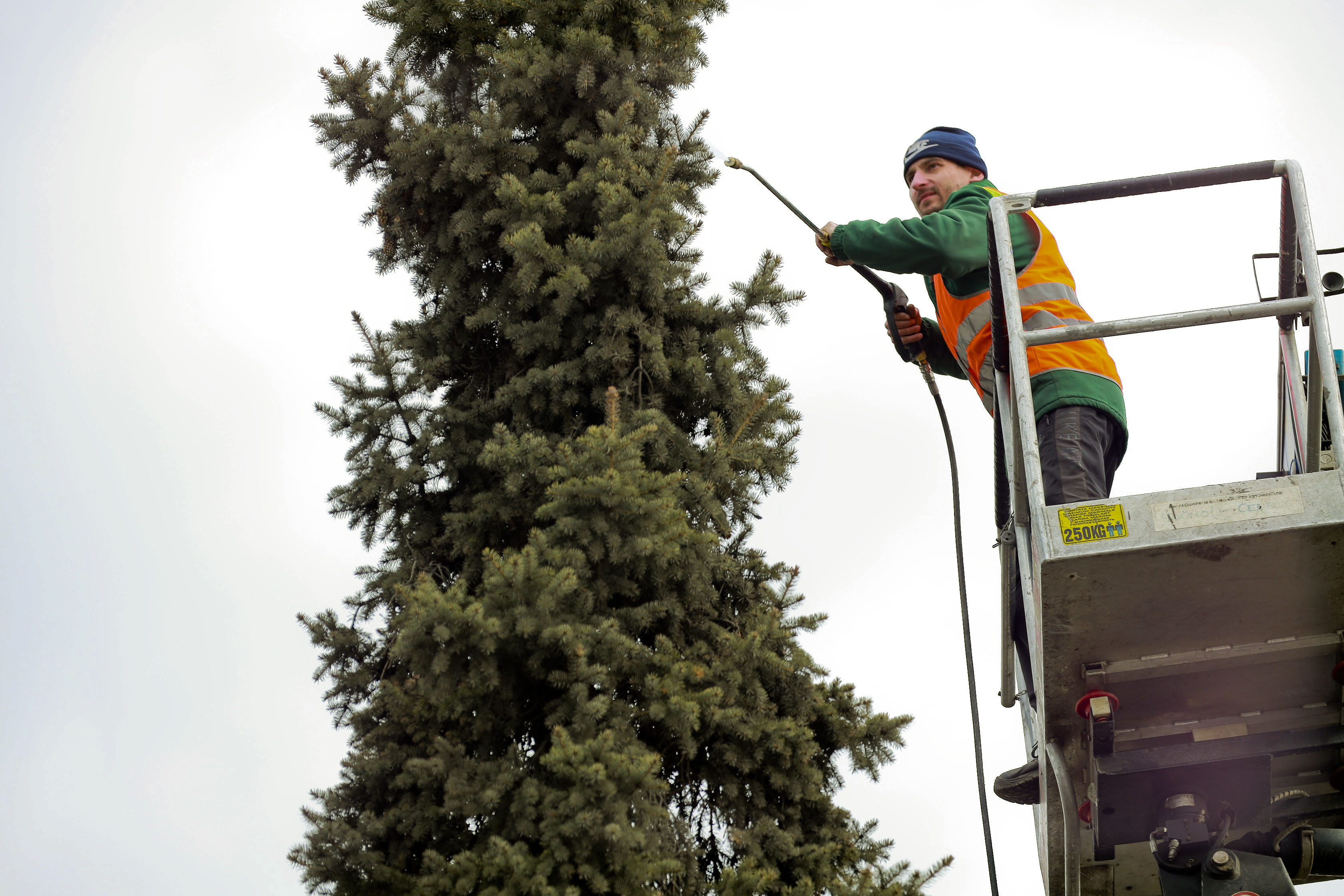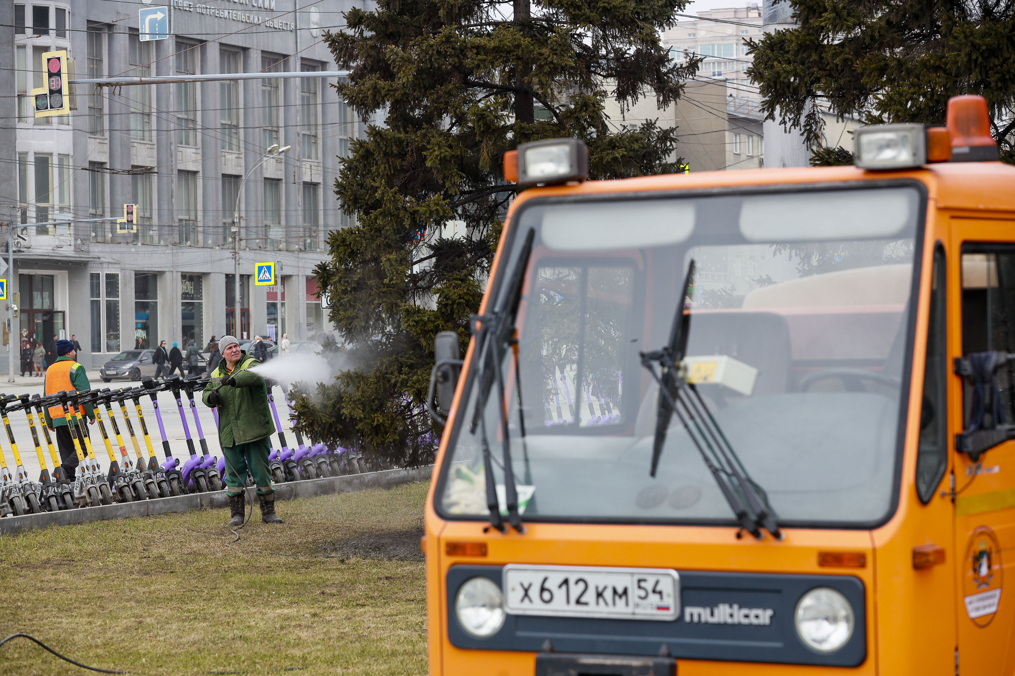 Ёлки от грязи отмыли на площади Ленина в Новосибирске