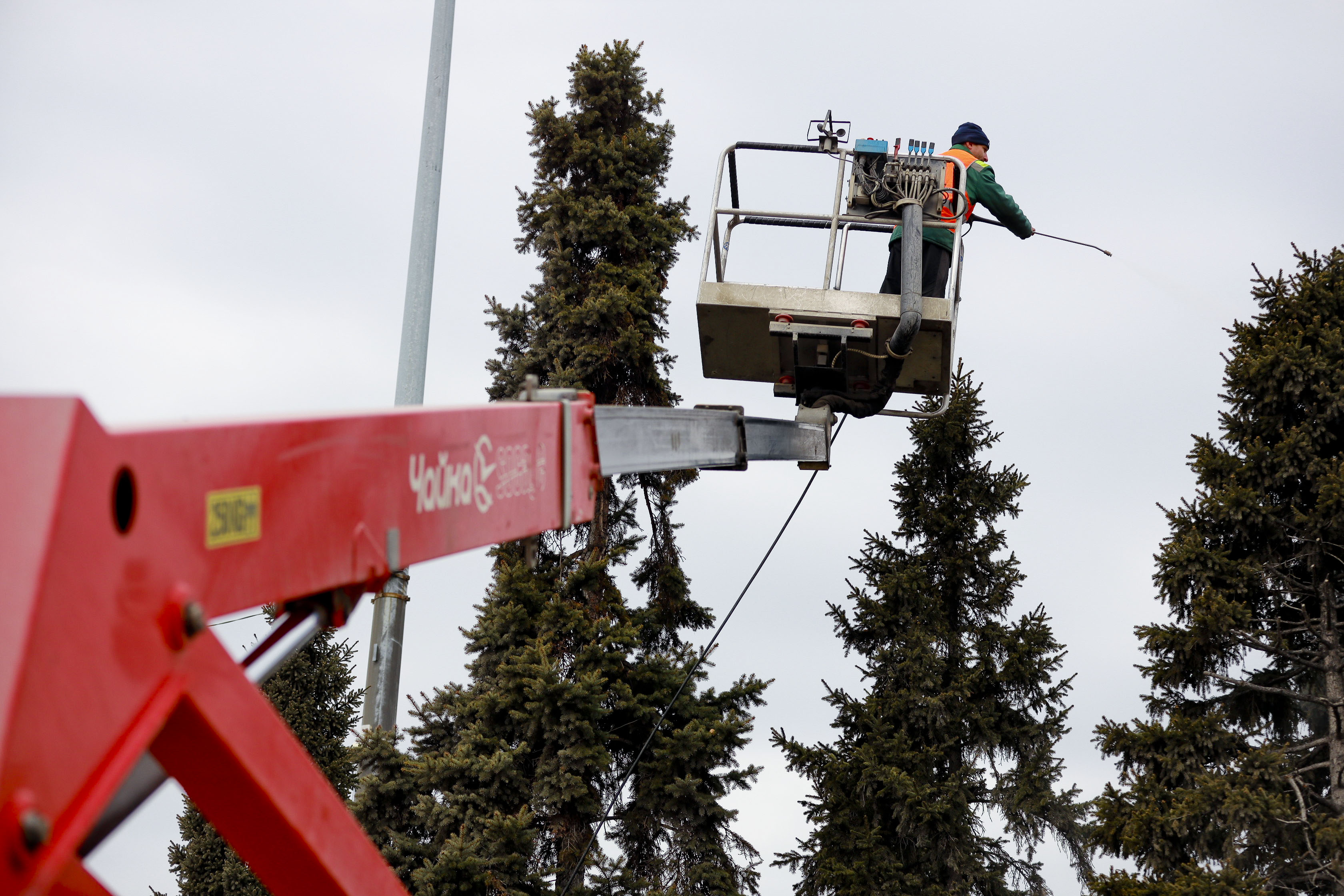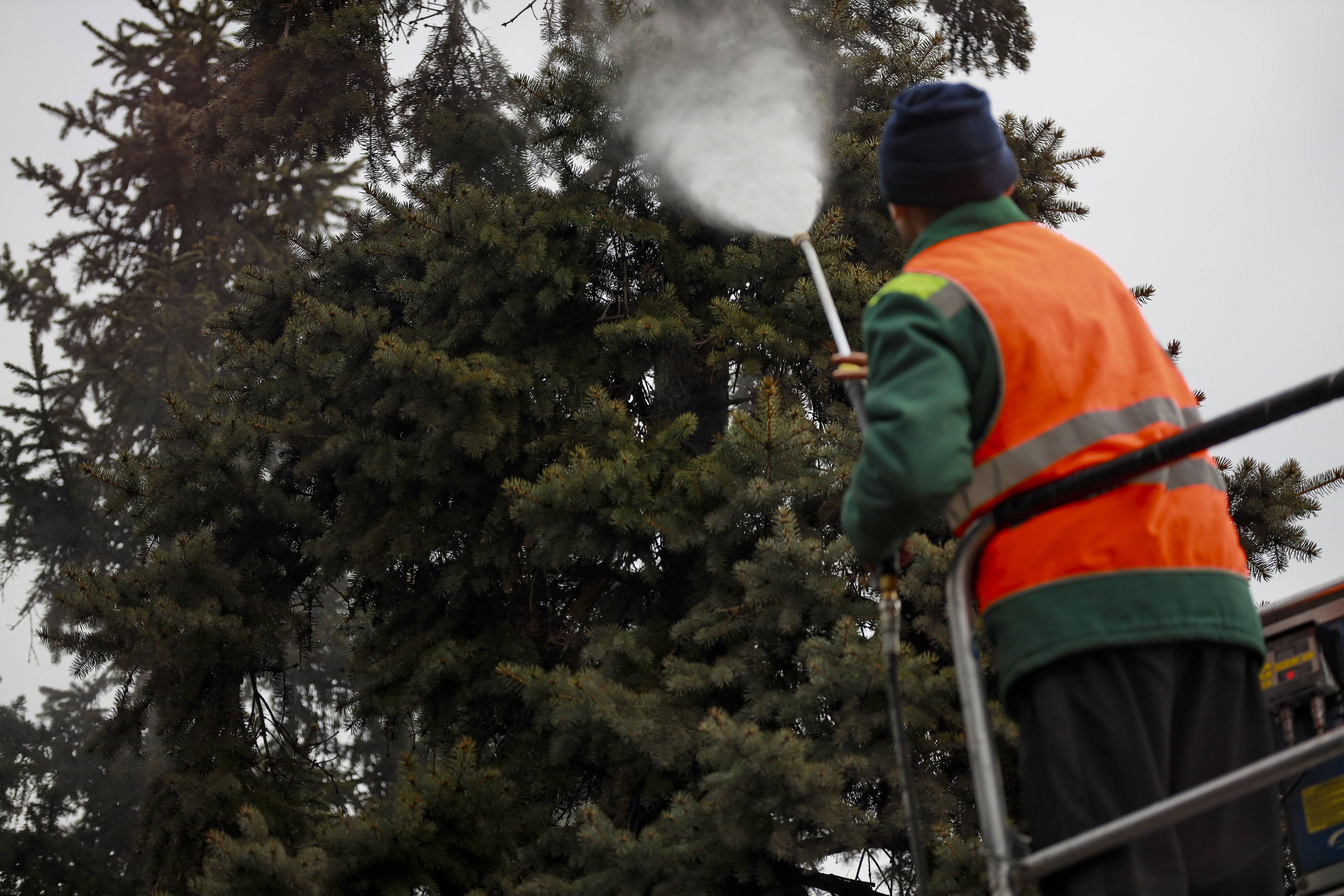 Чтобы достать до самых высоких ветвей, специалисты используют автовышку и поливочные машины. На помывку одного дерева требуется около 15 минут и 80 литров воды. Дождевание начинают с кроны, мыльный раствор легко смывает грязь, старую хвою и личинки вредителей со стволов.