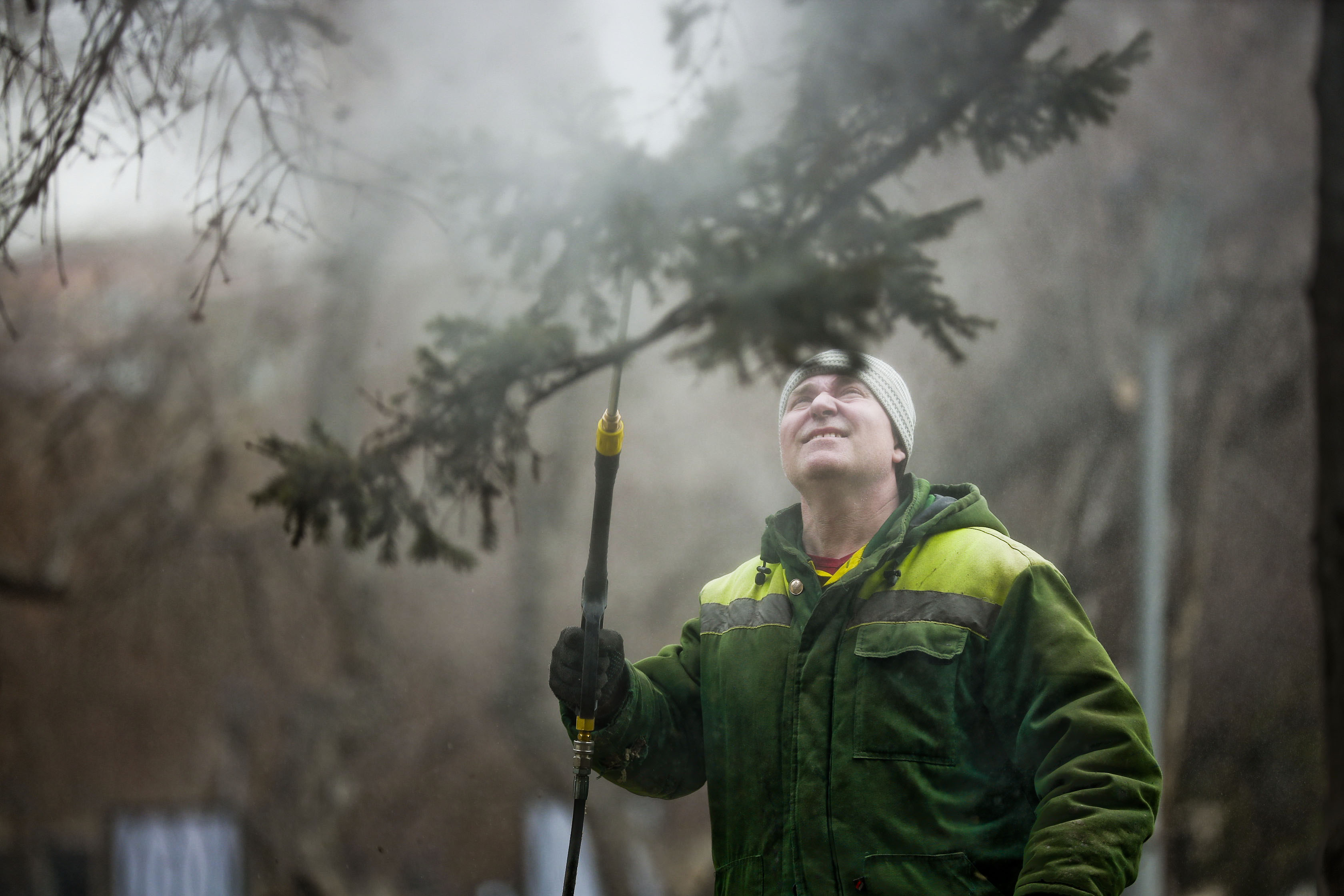 Этот процесс называют дождеванием. Деревья очищают от пыли водой под напором с применением безопасного мыльного раствора.