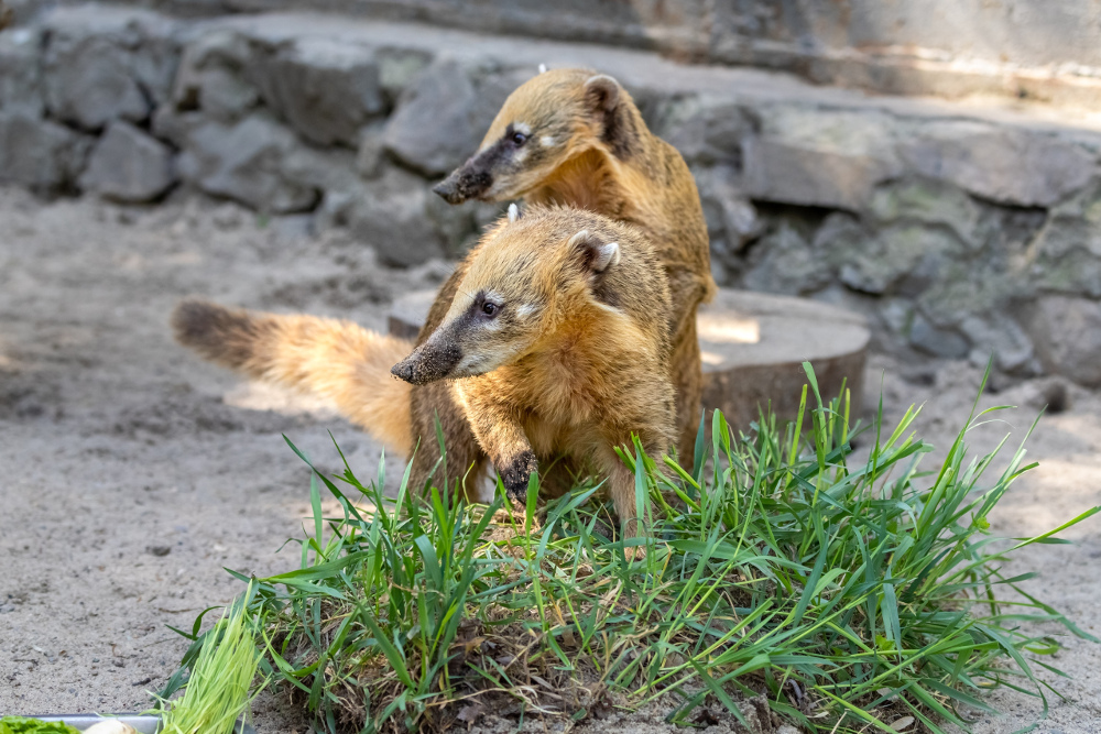 Еноты и носухи нюхают одуванчики в Новосибирском зоопарке