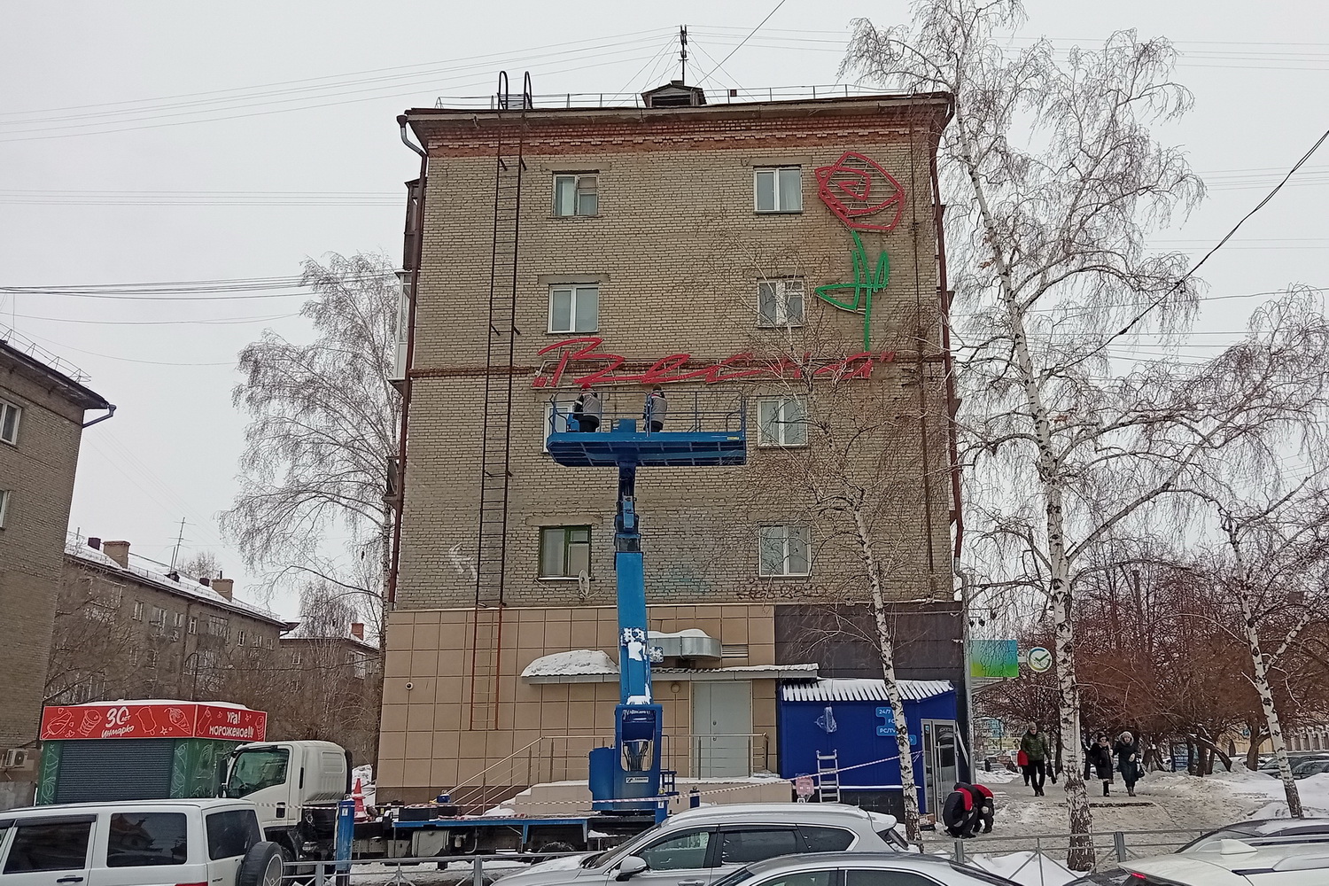 Легендарную вывеску с огромным цветком вернули на стену дома №1 на улице Гоголя. Пока это только металлический каркас. Из-за погоды неоновые трубки ещё не монтируют. Их установят и подключат в апреле, чтобы конструкция снова засветилась, как в советские годы.