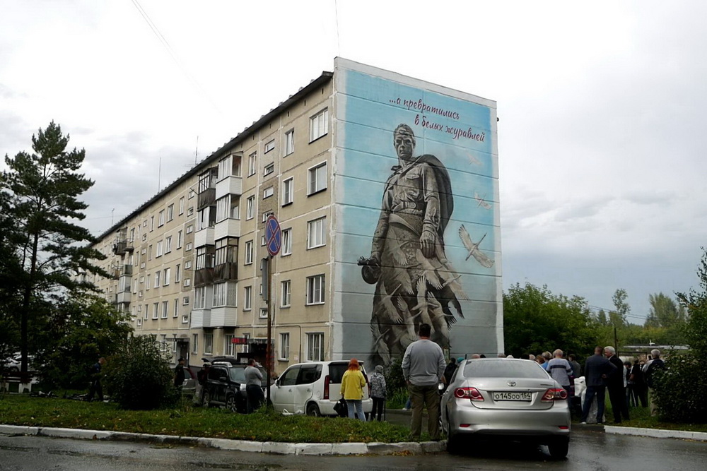 Мурал с воином и журавлями открыли на въезде в посёлок Гвардейский