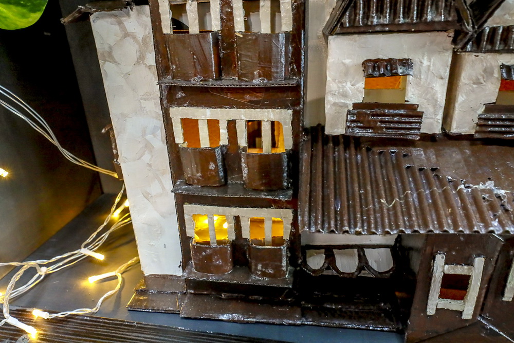 «Подобрал коробочки, собрал, прорезал окна и двери, соединил, подклеил, потом покрасил, покрыл сверху акриловым лаком — готово. Ничего сложного. Сделаем окна, подведём освещение с помощью гирлянды — и вот уже хочется туда заглянуть», — отмечает автор.