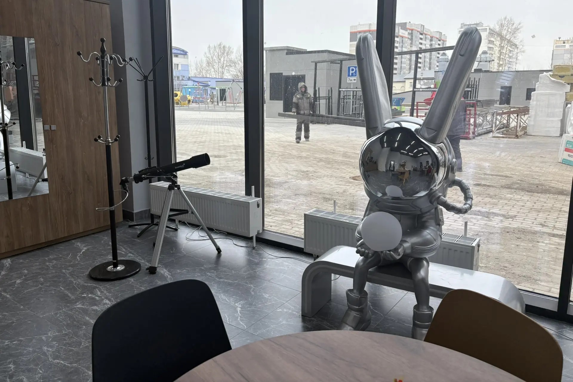 Кстати, это не единственный космический элемент в будущем ЖК. У входа размещена металлическая модель планеты, внутри можно найти инопланетных персонажей и даже телескоп. Интерьер дополняют экраны с картами созвездий. На этой неделе будущие новосёлы и блогеры заложили на территории комплекса «Лунный сад».