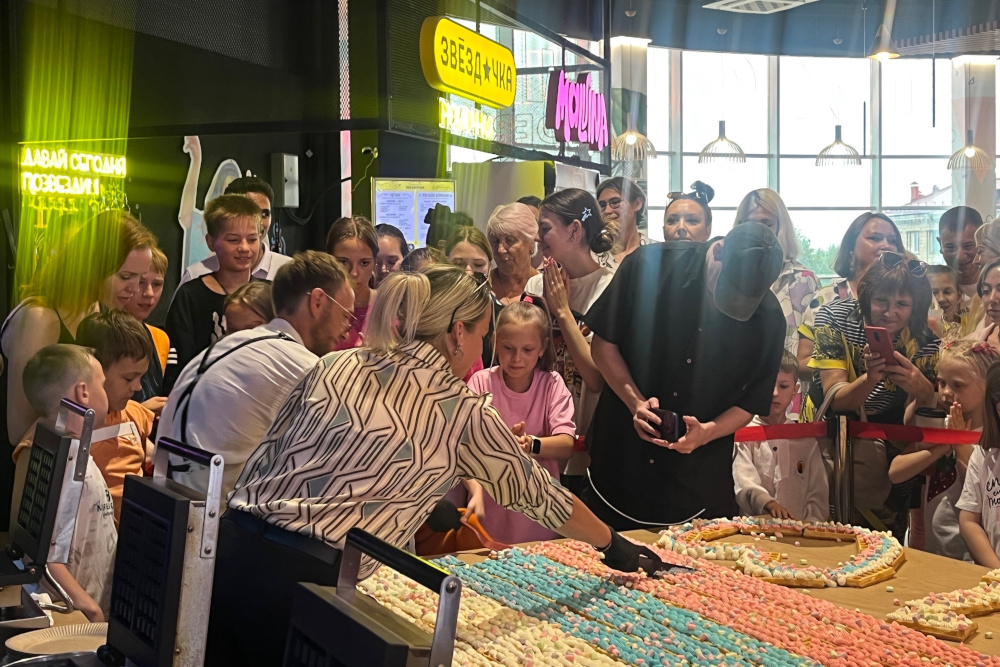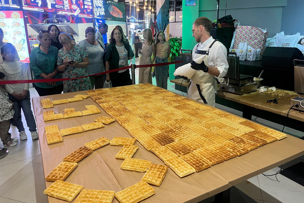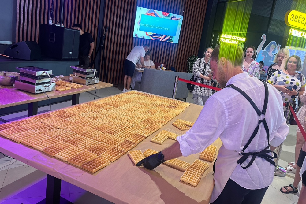 Новосибирцы наблюдали за интригующим зрелищем с большим аппетитом. Кондитер выпекал, а затем по очереди выкладывал вафли друг к другу. В итоге получилась одна гигантская. К основной её части автор добавил сердечко и цифру «131» — в честь 131-го дня рождения города.