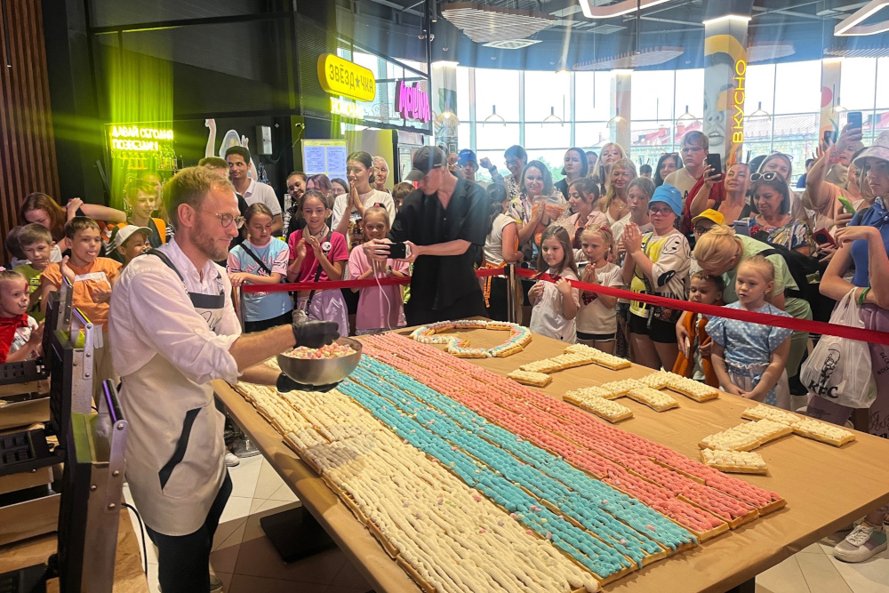 В завершение композицию оформили сливочным топингом в цветах российского флага и обсыпали её маршмеллоу. Оценить результат первыми выстроились дети, за ними — взрослые. Публика осталась довольна.