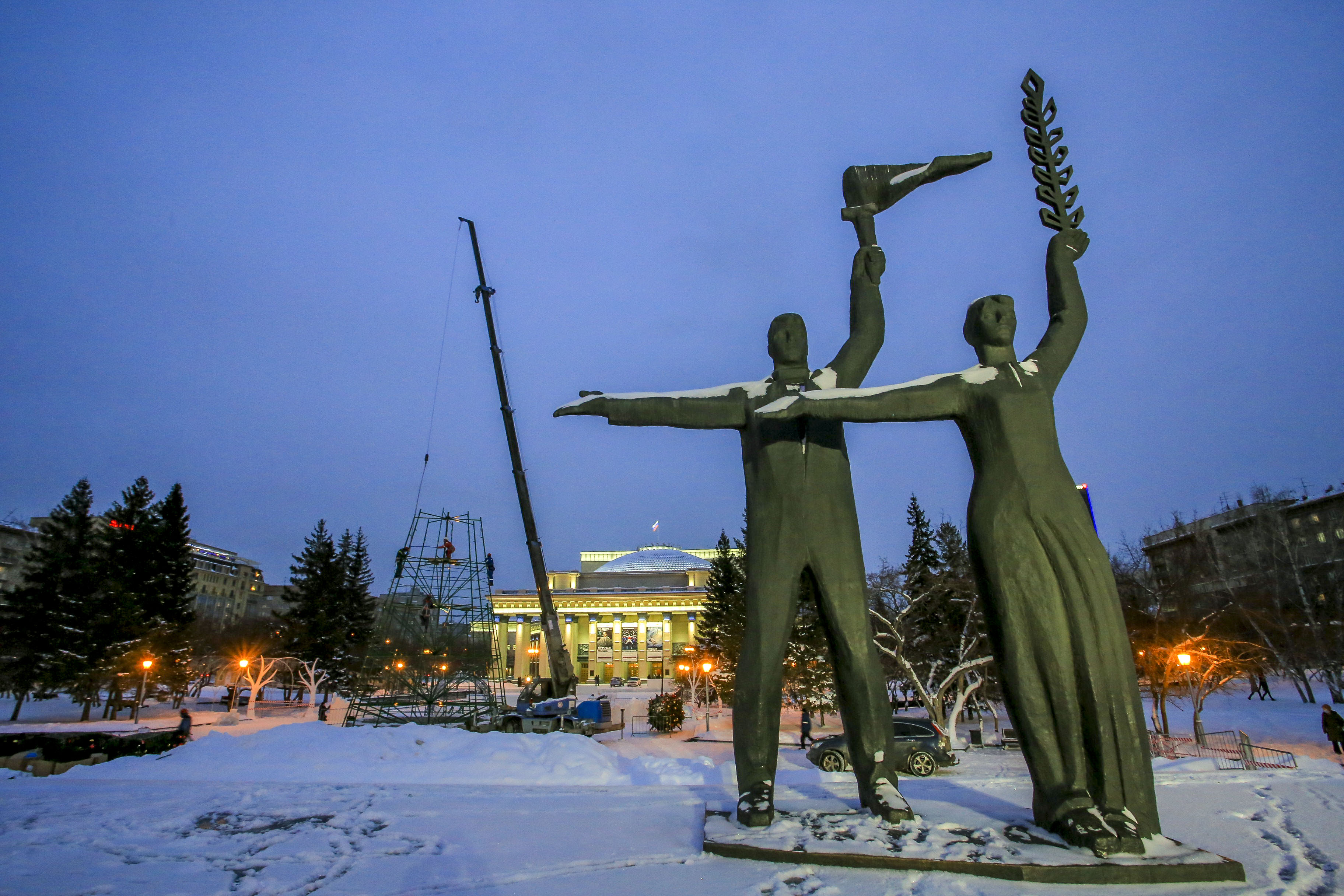 В субботу, 12 декабря, рабочие приступили к монтажу новогодней ели на площади Ленина перед новосибирским театром оперы и балета.