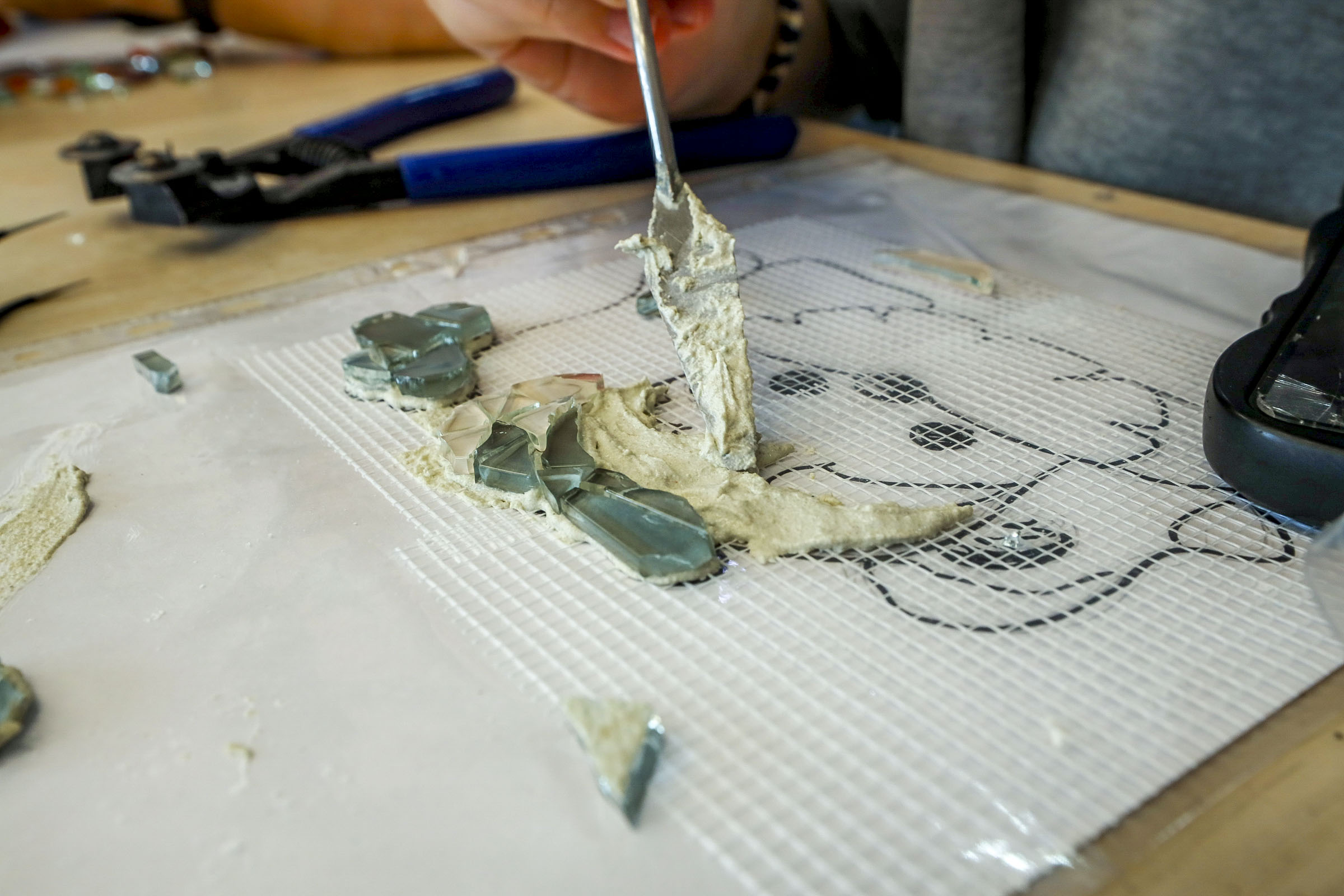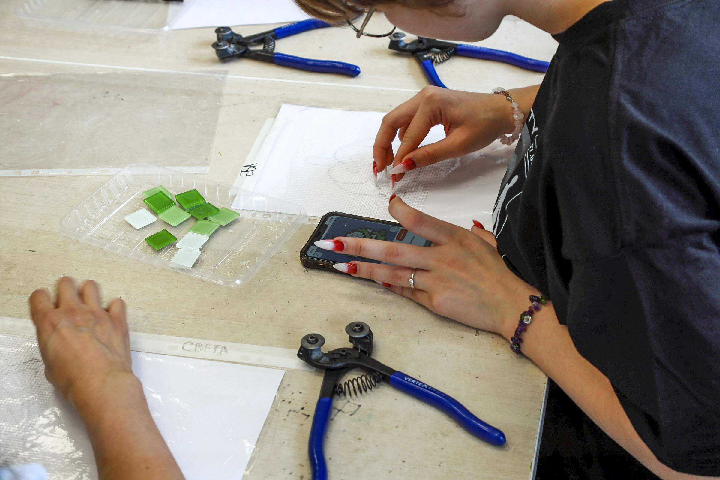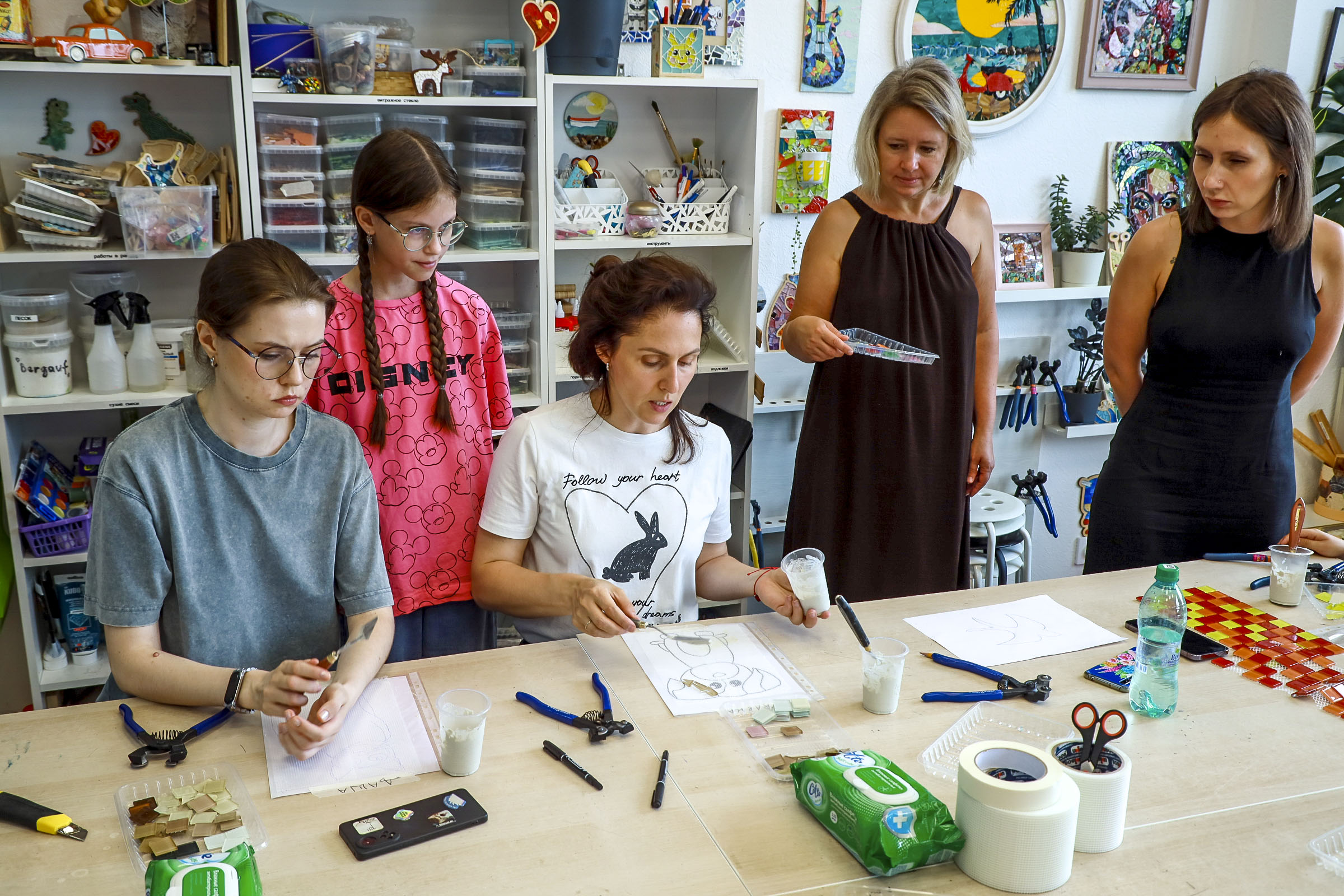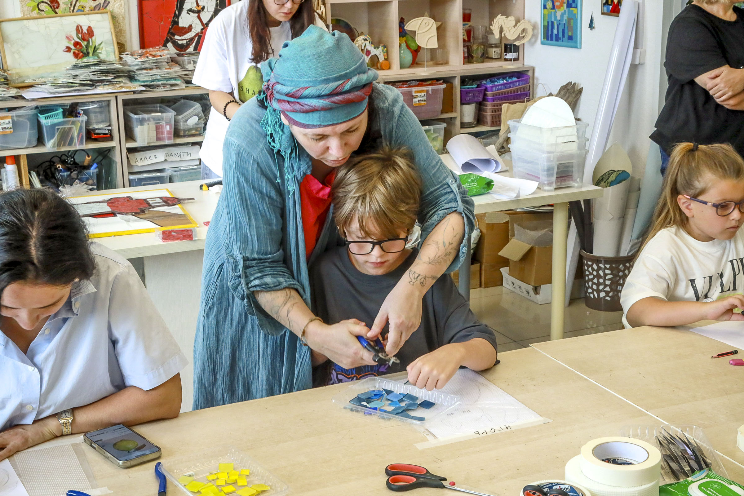 Во втором, независимом этапе пригласили участвовать всех желающих — взрослых и детей от семи лет. Они делали мозаичных собак, кошек, птиц, бабочек и белок. Более 150 фигурок животных дополнят нарисованную инсталляцию, которой окружат основной витраж.