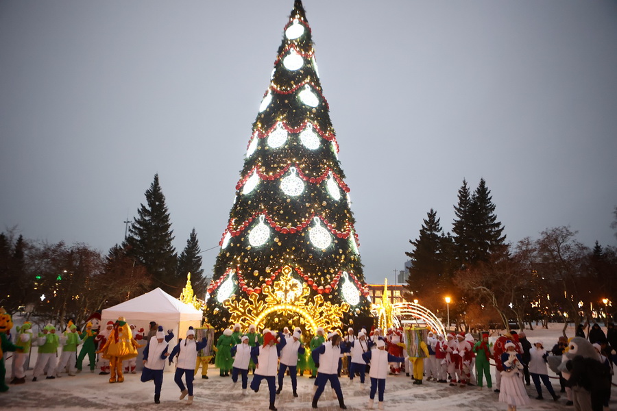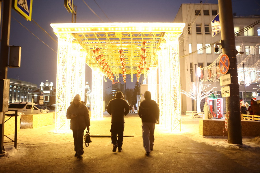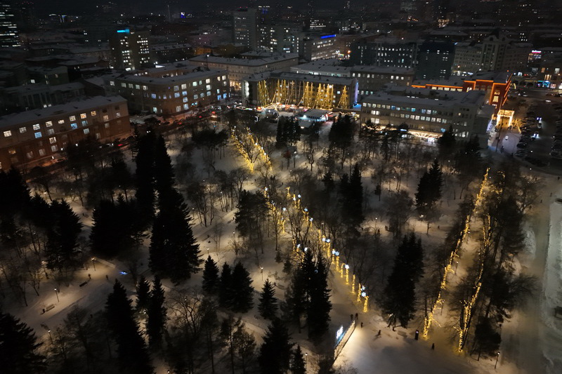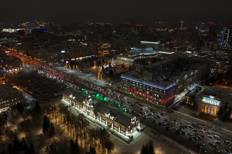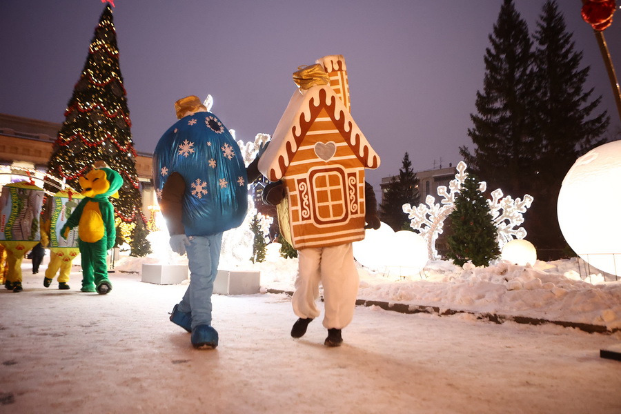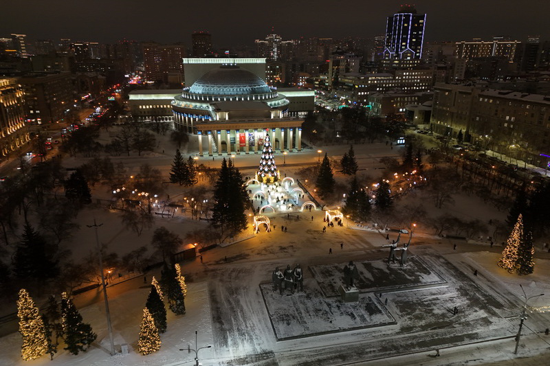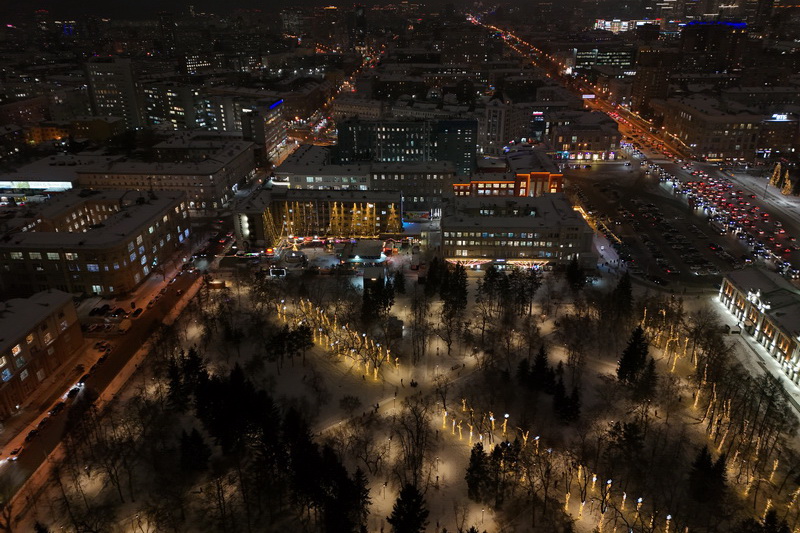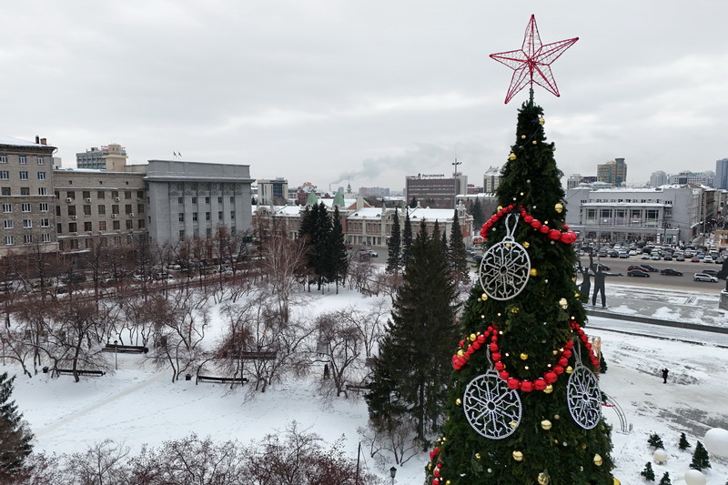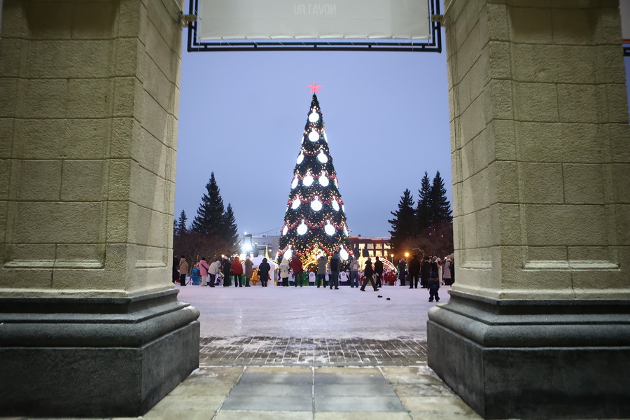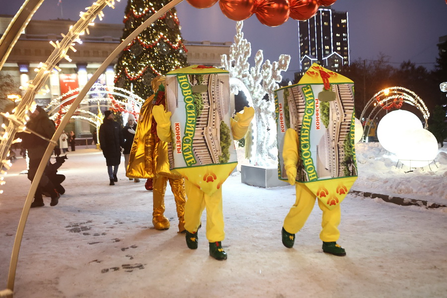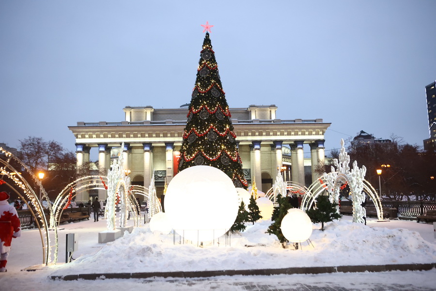 В Театральном сквере засияла главная городская ёлка, наряженная в русском стиле. Вокруг неё развешали гирлянды и разместили фотозоны. Пешеходный участок улицы Ленина украсили переливающимся потолком, светящимися шарами, искусственными елями и инсталляциями Сибирского фестиваля новогодних арт-объектов. На входе со стороны площади, как и в прошлые годы, водрузили арку.
