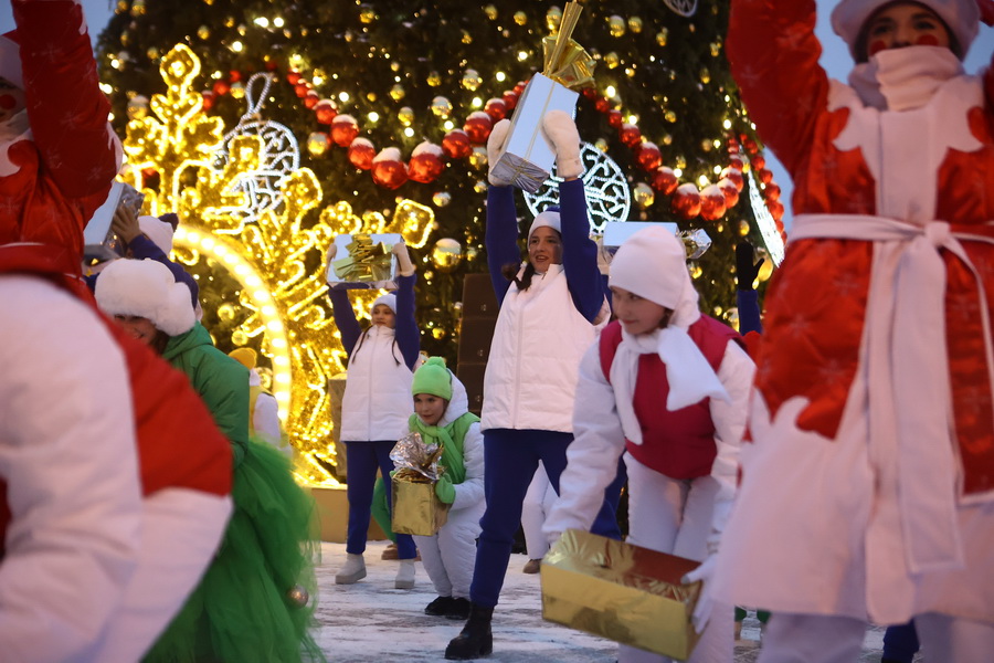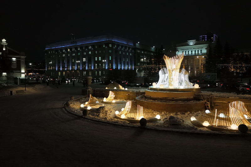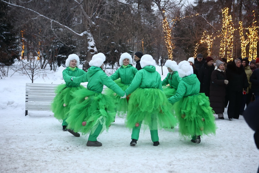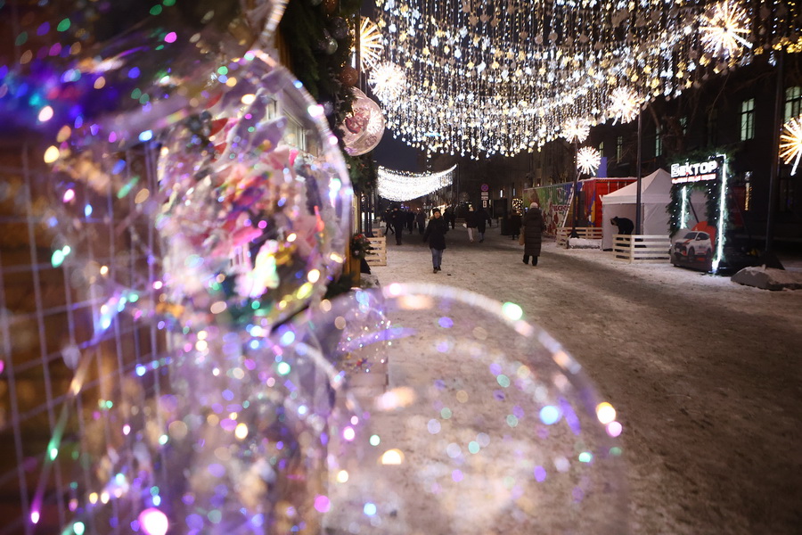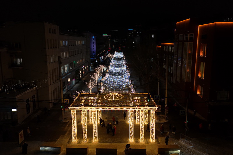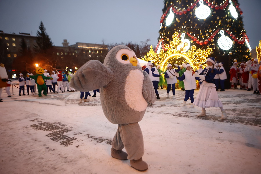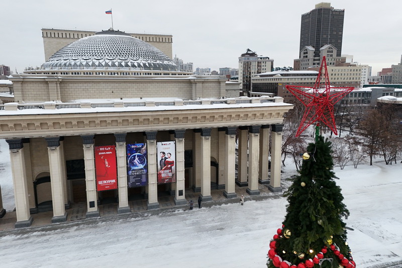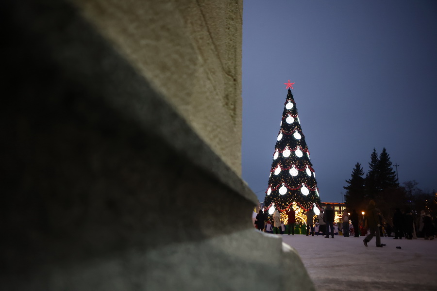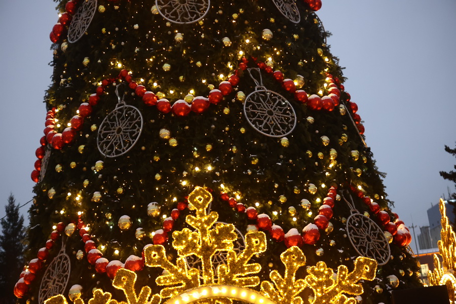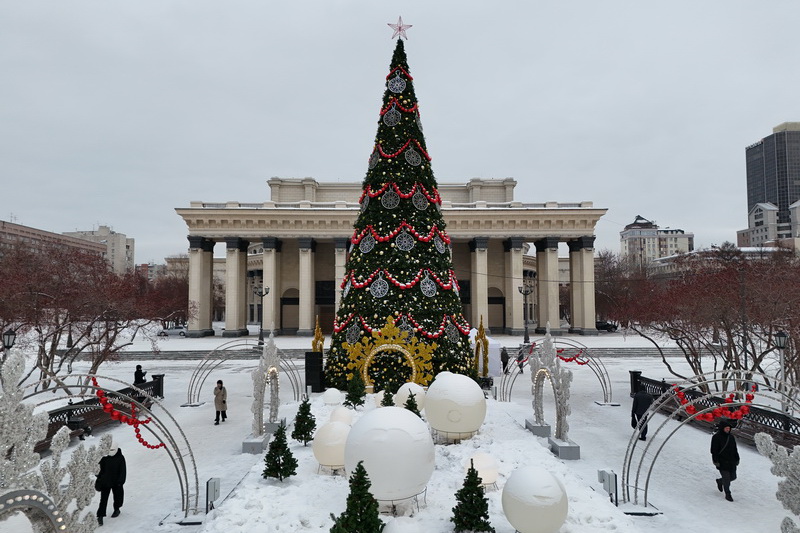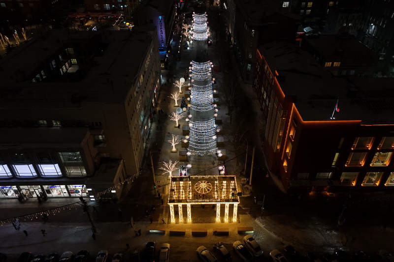 В Театральном сквере засияла главная городская ёлка, наряженная в русском стиле. Вокруг неё развешали гирлянды и разместили фотозоны. Пешеходный участок улицы Ленина украсили переливающимся потолком, светящимися шарами, искусственными елями и инсталляциями Сибирского фестиваля новогодних арт-объектов. На входе со стороны площади, как и в прошлые годы, водрузили арку.