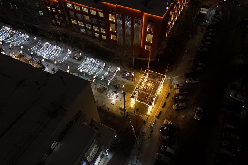 Первомайский сквер оформили зимним фонтаном, а деревья на двух аллеях нарядили в гирлянды и снежинки. Здесь же установили световые шары и тоннели. На центральной аллее к 15 декабря впервые оборудуют праздничную локацию от компании «Аэрофлот».