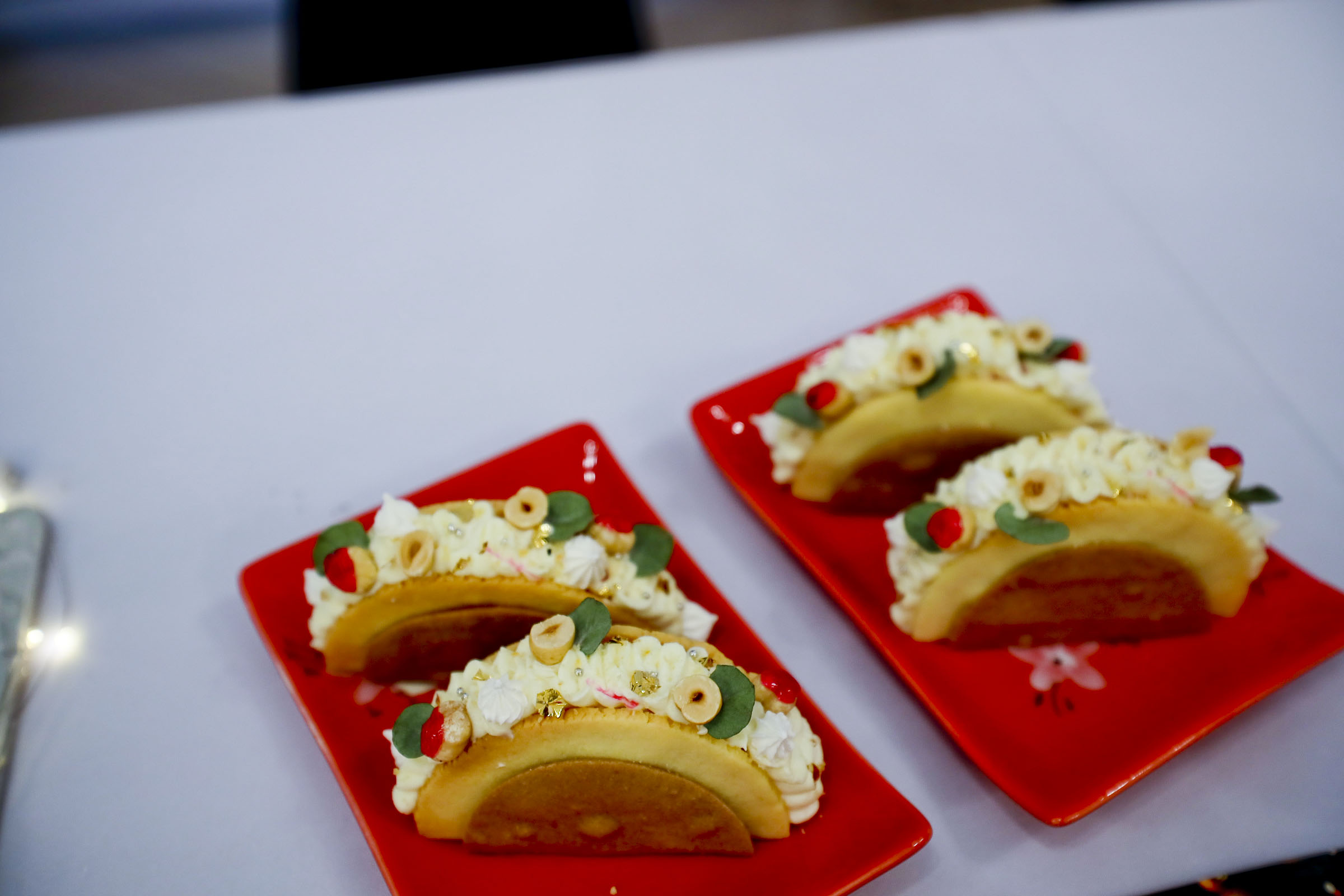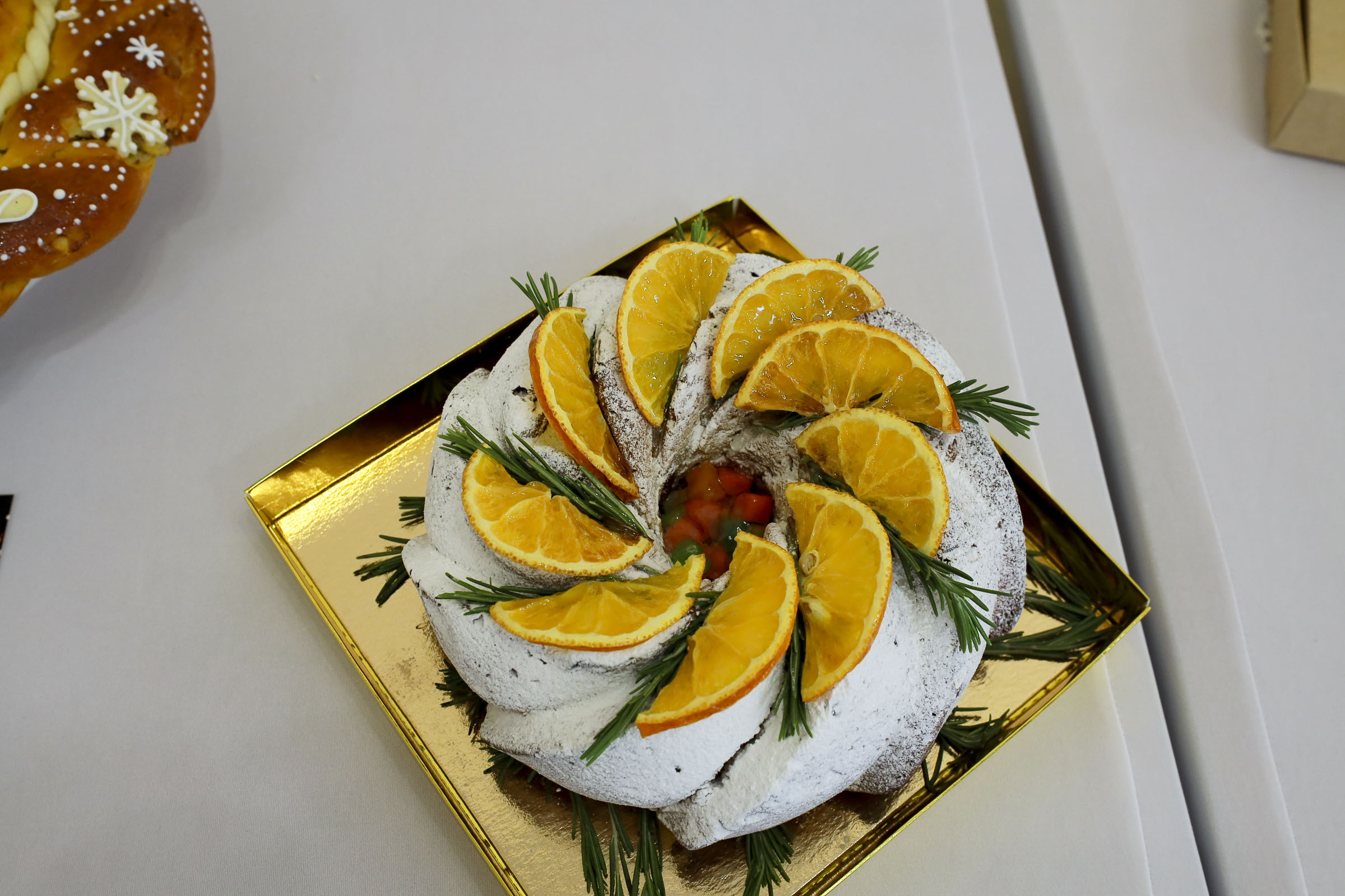 «Это изделие называется „Жемчужина Сибири“. Здесь представлено пирожное из розмаринового мусса с сердцевиной из желе апельсина. Подаётся это всё на кедровом крамбле. Это создаёт такой сибирско-цитрусовый вкус Нового года и Сибири в целом», — представил свою работу участник конкурса «Новосибирский десерт» Вадим Наклескин.