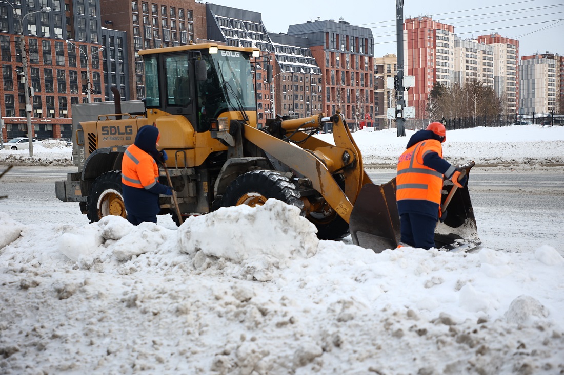 Комплексную уборку ведут в Калининском районе. На улице Тюленина работают 12 машин: снегоуборщики, тракторы, самосвалы и малогабаритная техника. Там, где они не проходят, приходится расчищать вручную.