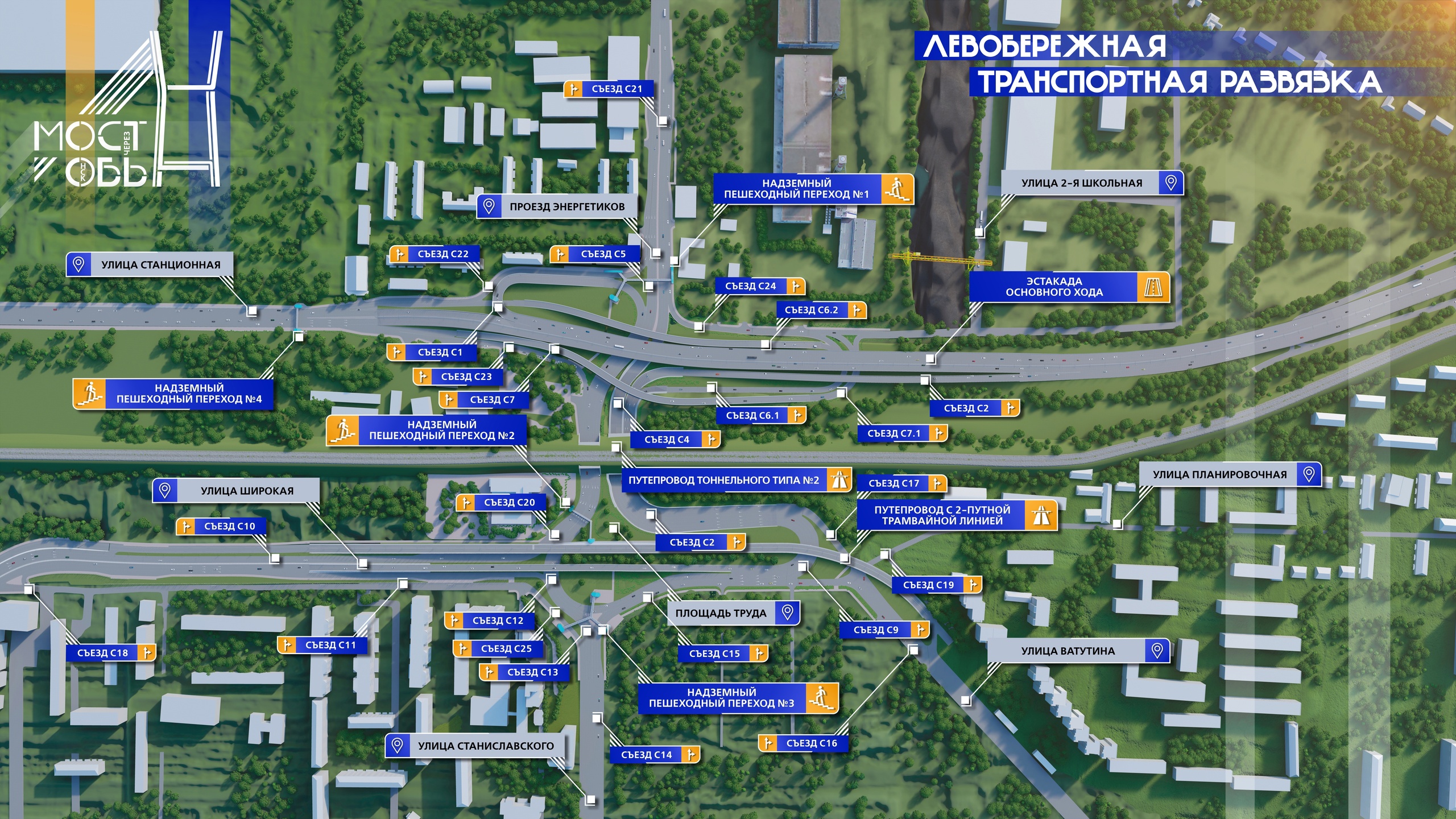 По информации холдинга, всего у развязки на левом берегу предусмотрено 25 съездов. Пять из них уже сдали. Сейчас подрядчики завершают подготовку к открытию дорожного съезда 6.1, по которому транспорт пойдёт с улицы Станиславского через площадь Труда в сторону ТЭЦ-2. Ответвление откроют в начале октября, оно станет шестым доступным для водителей.
