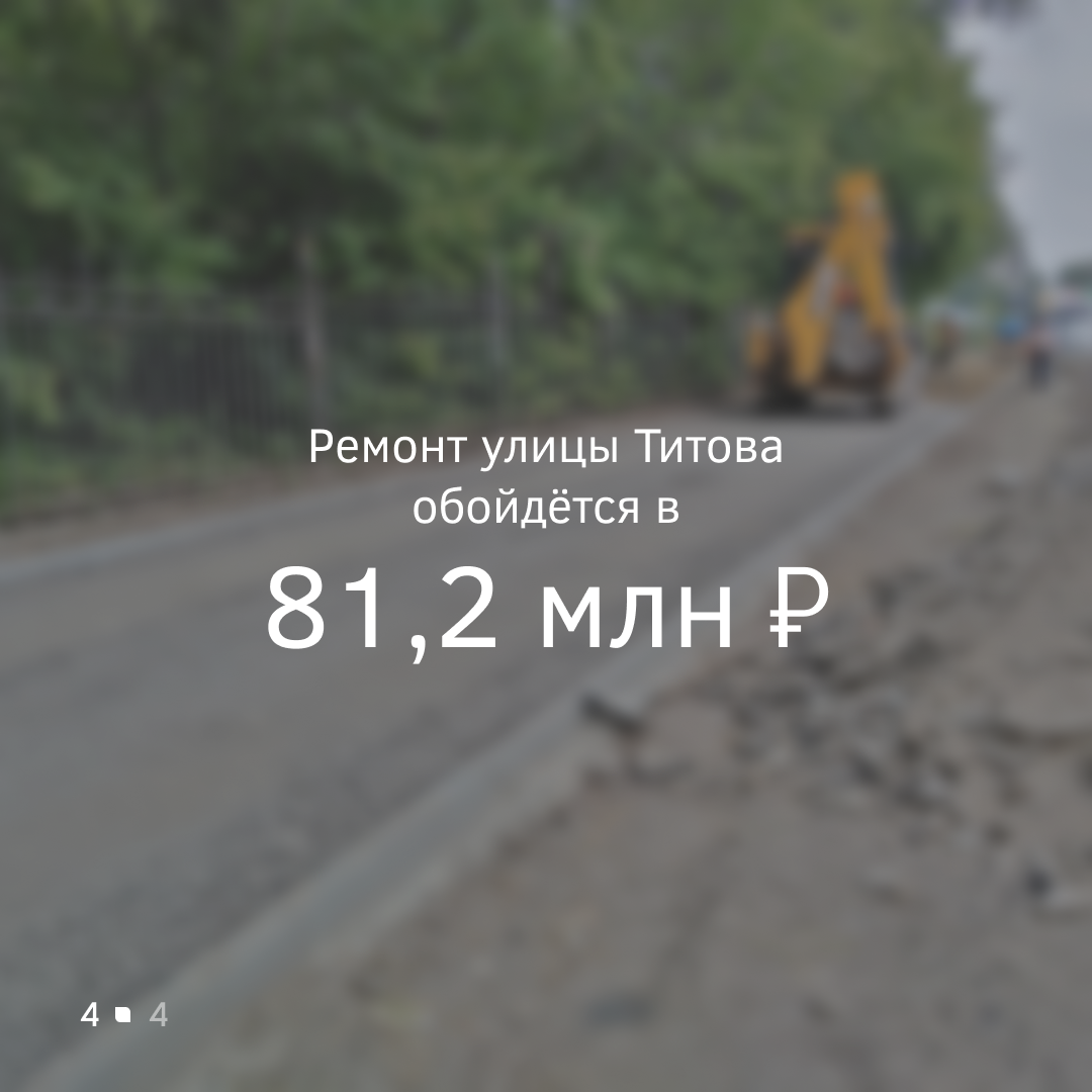 Ремонт улицы Титова обойдётся в 81,2 млн рублей. Гарантийный срок устранения дефектов для верхнего слоя асфальтобетонного покрытия — шесть лет, для тротуаров и пешеходных дорожек — пять лет, для дорожных знаков — десять лет, для разметки — один год.
