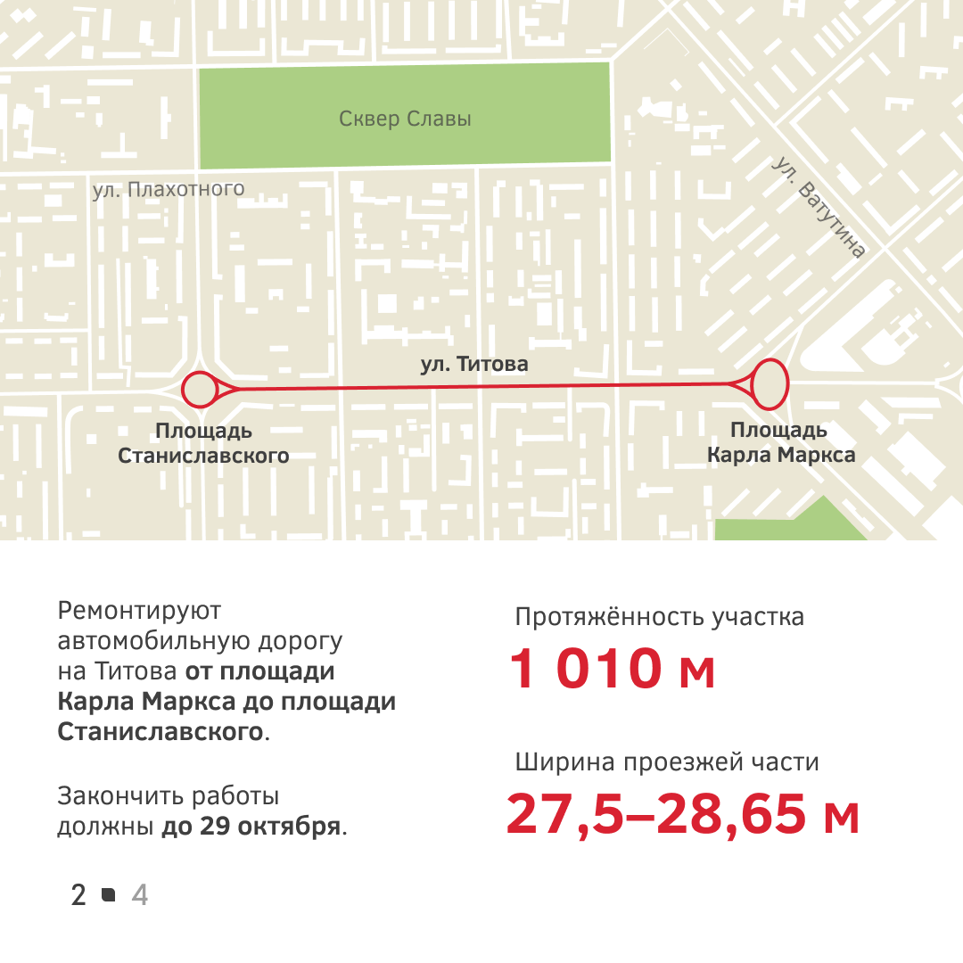 Ремонт автомобильной дороги общего пользования на улице Титова от площади Карла Маркса до площади Станиславского в Ленинском районе должен завершиться до 29 октября. Такая дата указана в муниципальном контракте, заключённом с подрядной организацией ООО «СТС-Плюс».