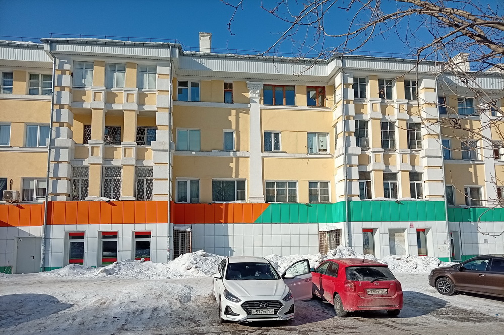 В 1956-м построили пятиэтажный жилой дом на Котовского, 7. У него отреставрированный фасад, богато украшенный неоклассическим декором — здесь и карнизы, и пилястры, и капители, и мощные колонны. Всё выделено яркими цветами на основном спокойном фоне.