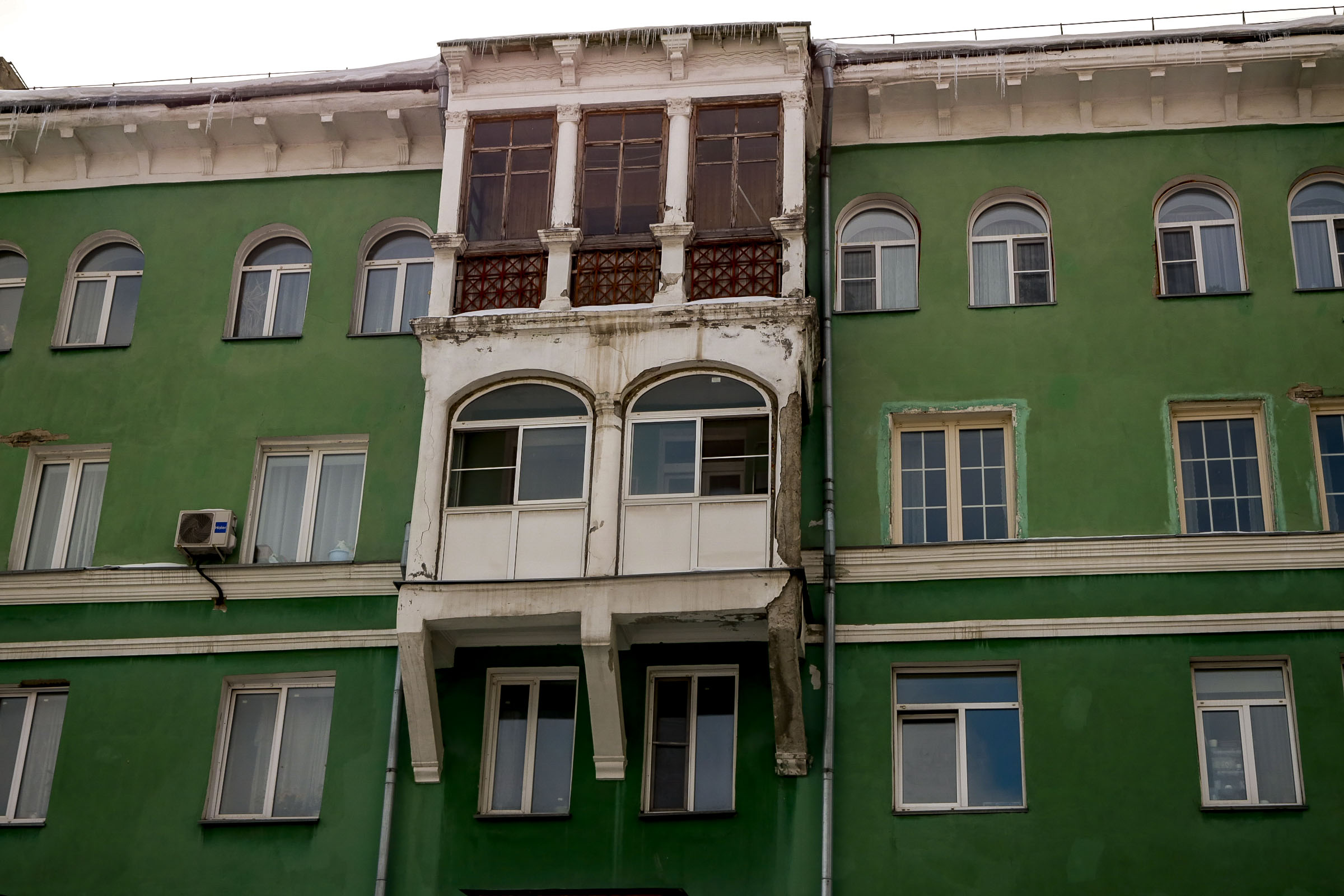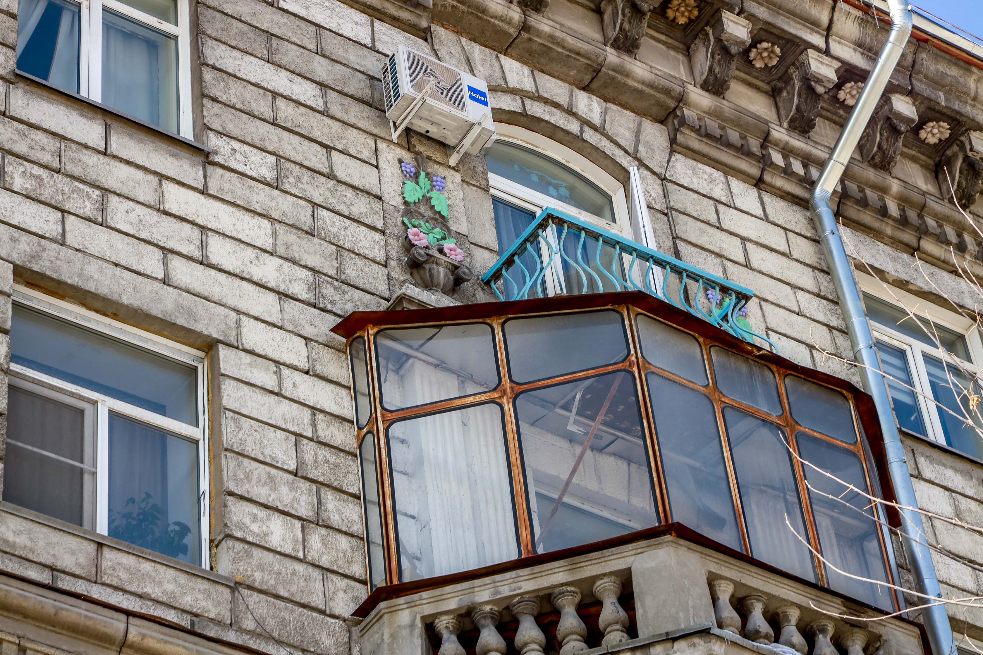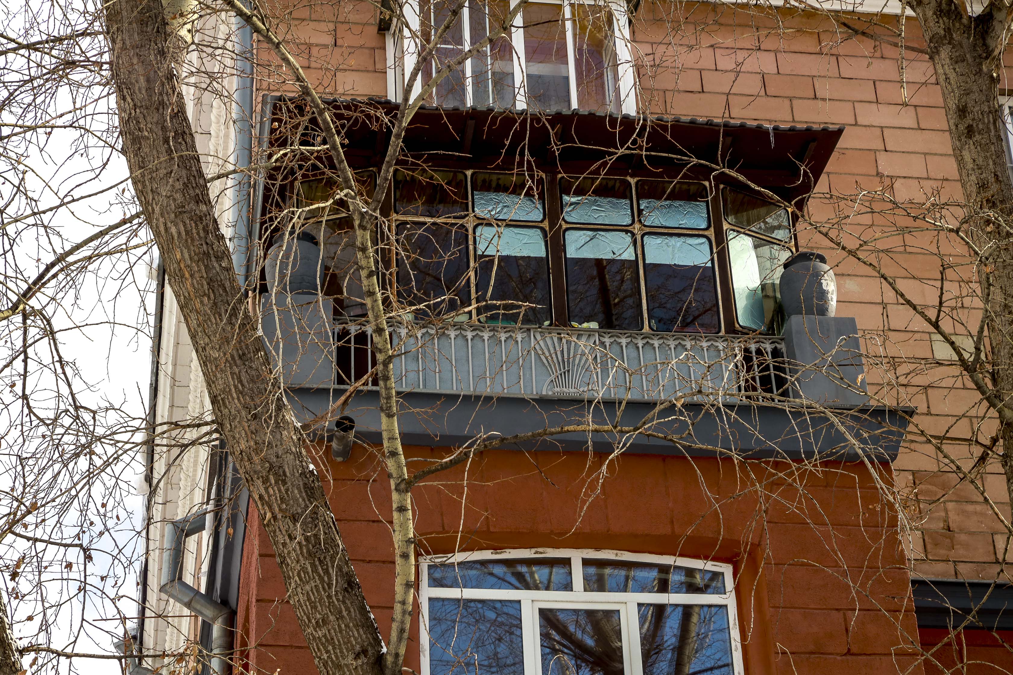 На одном из балконов пятого этажа на Станиславского, 10 хорошо видно расписанный в разные цвета лепной декор. Жильцы, видимо, решили добавить праздника в будничную рутину. И у них это получилось.