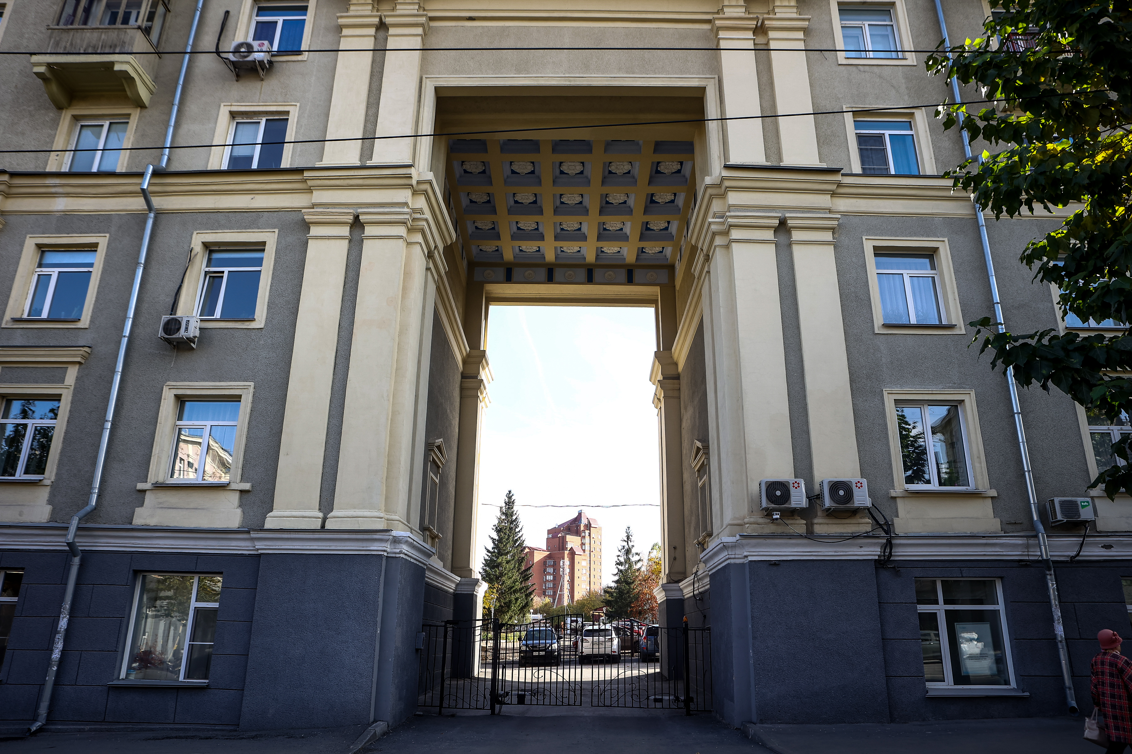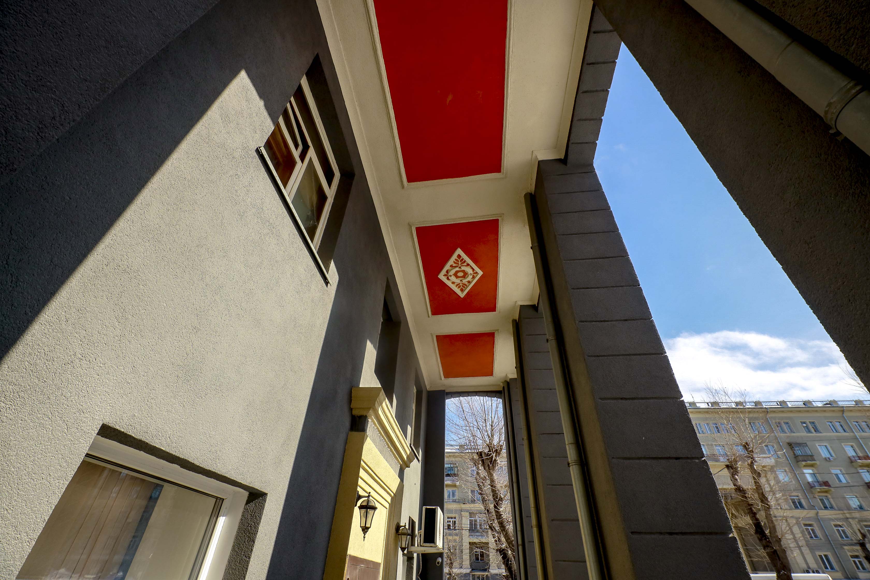 Главная изюминка семиэтажки на Станиславского, 3 — это огромная арка. В солнечный день кажется, что сквозь неё видно небо. На самом деле нет: просто потолок украшен белыми гипсовыми розетками на голубом фоне. Так создаётся эффект прозрачности. Высота арки равна четырём этажам, ширина — шесть метров. Дом построили в 1941 году.