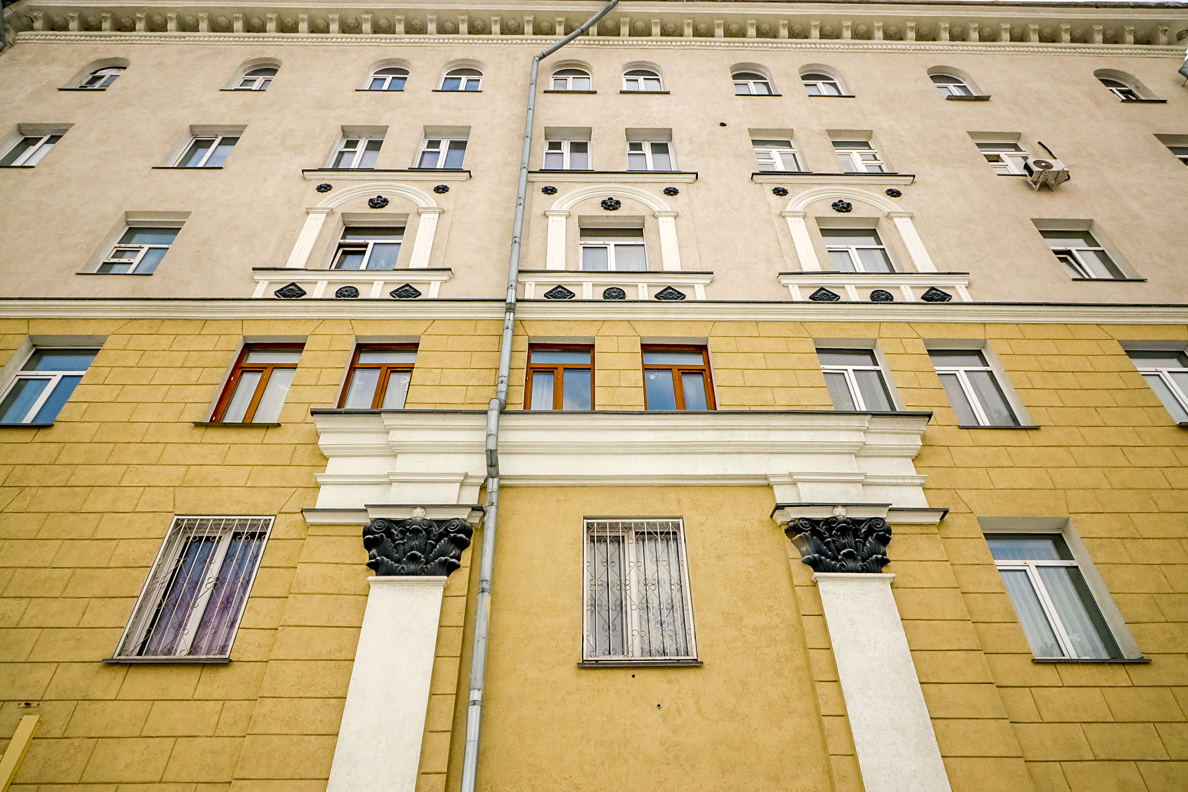 Дом на Станиславского, 12 построили в 1955-м. В убранстве не скупились на лепнину. Осталось только акцентировать её цветом, как на соседних зданиях.