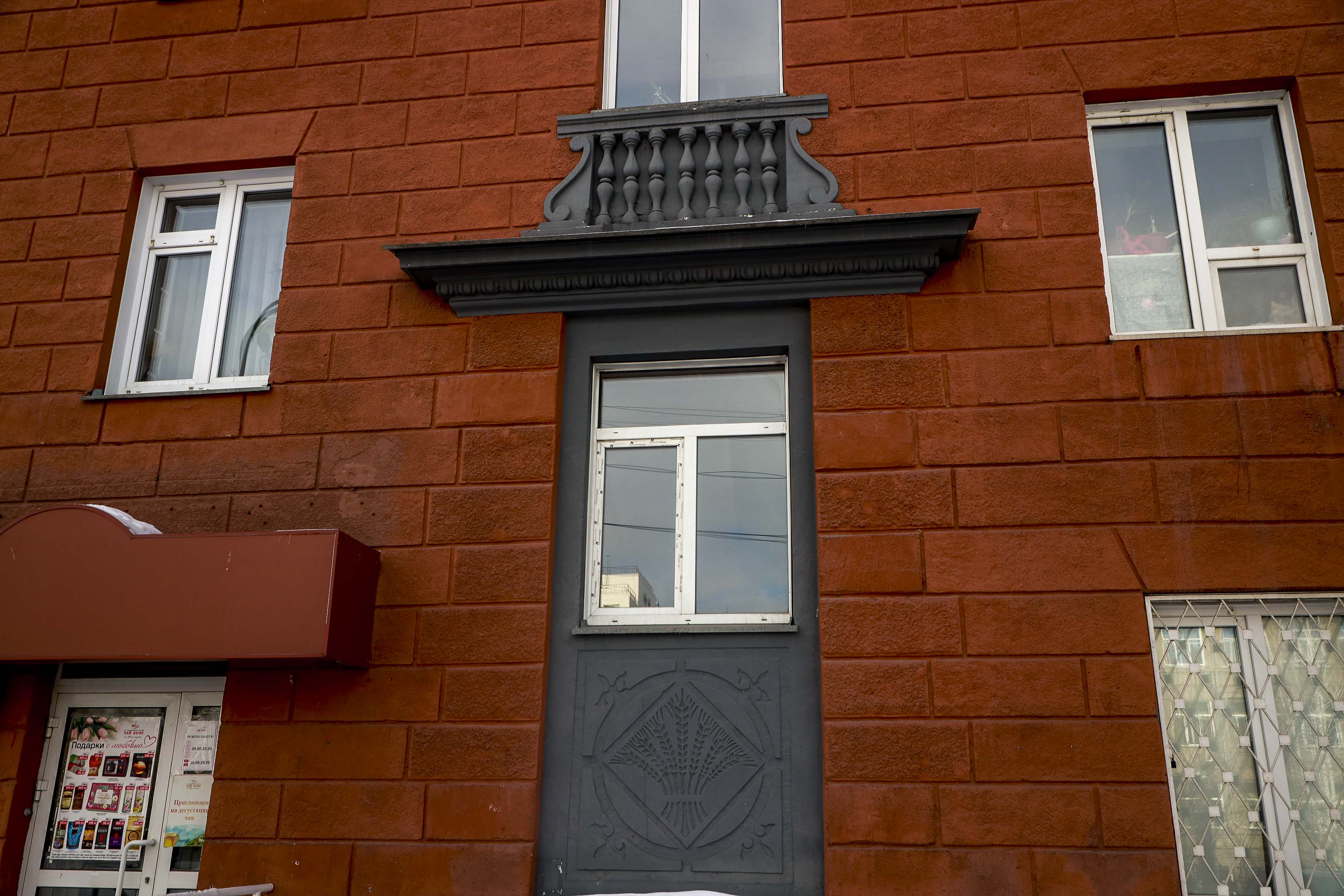 Фасад здания и балконные решётки украшены барельефами в виде снопов пшеницы с серпами, а также цветной росписью.