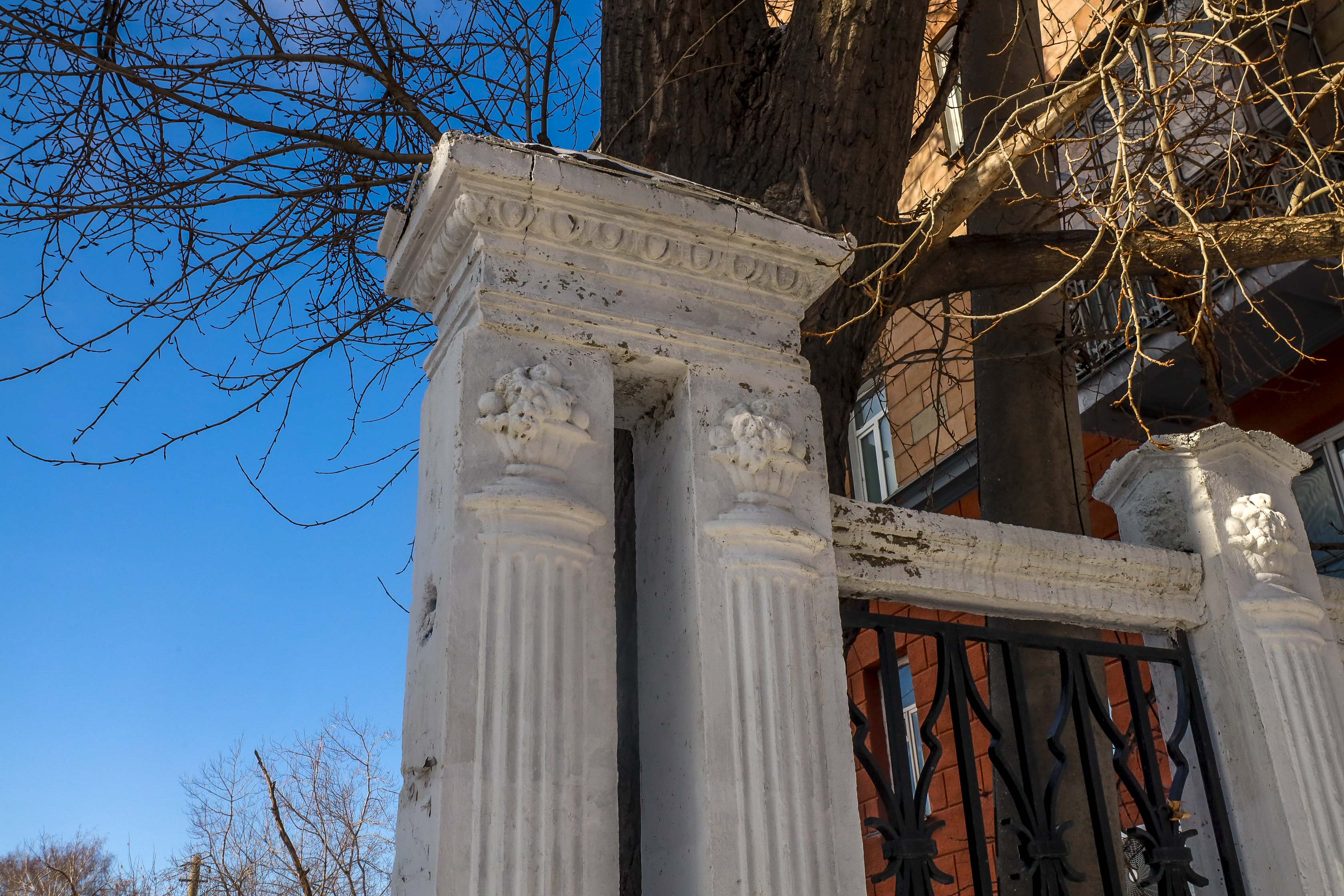 Между домами сохранились остатки каменной ограды с металлическими решётками. На столбах угадываются пилястры с каннелюрами, увенчанные вазонами с фруктами.