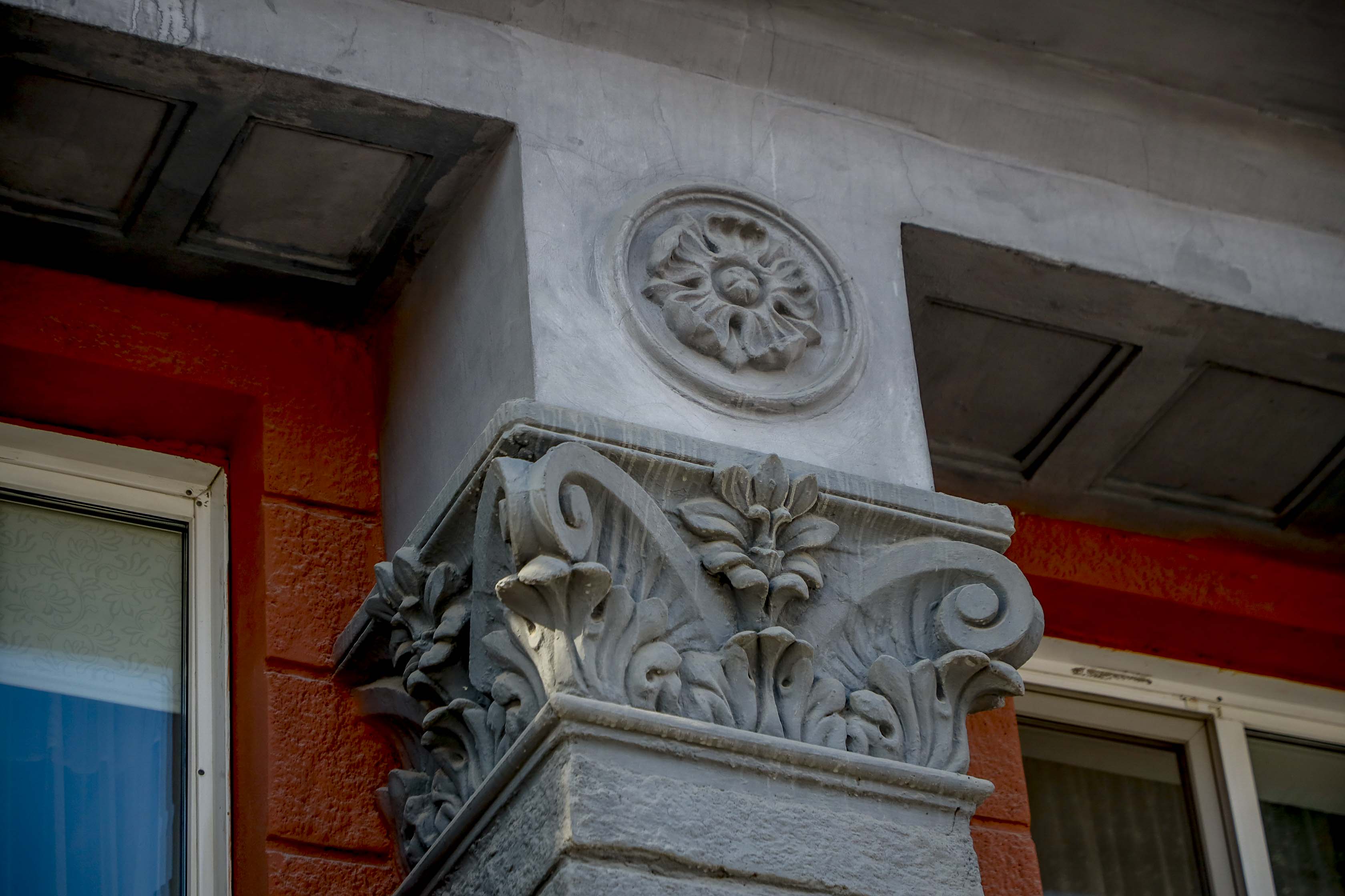 У здания на Станиславского, 8, введённого в 1956 году, тоже есть свои фишки. Углублённые балконы на четвёртом этаже оформлены колоннами с лаконичными капителями и лепниной в виде вазонов с цветами.