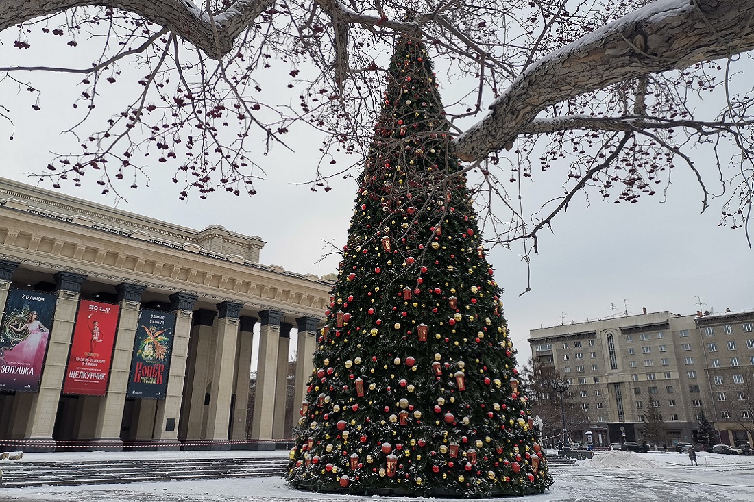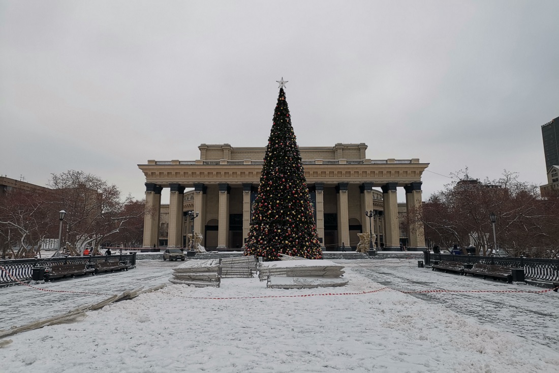 Главную ёлку Новосибирска установили в выходные на площади Ленина. 21-метровую конструкцию собрали и украсили всего за два дня. В этот раз дерево разместили ближе к театру оперы и балета.